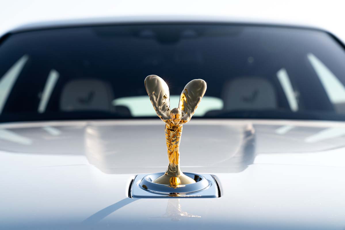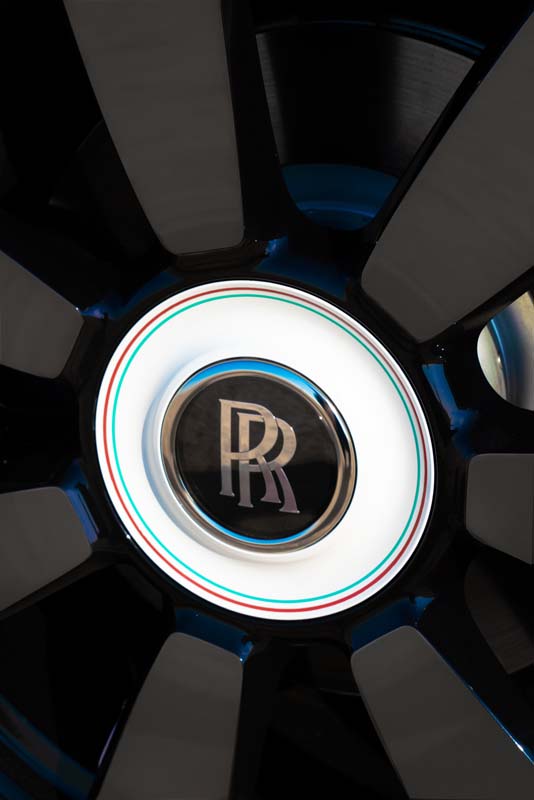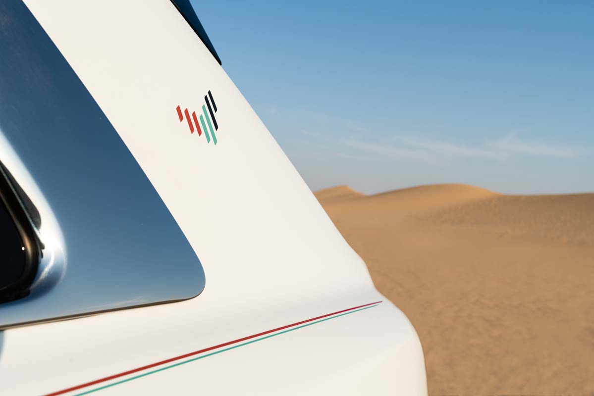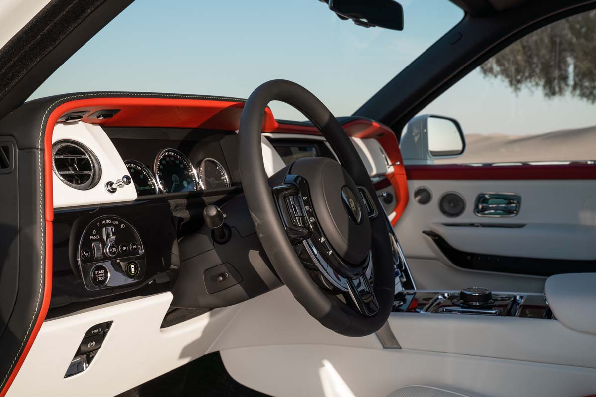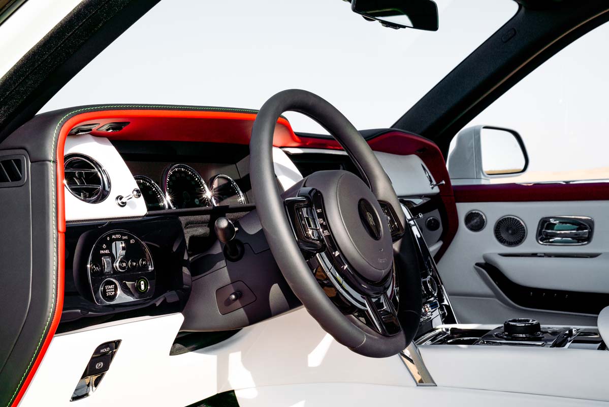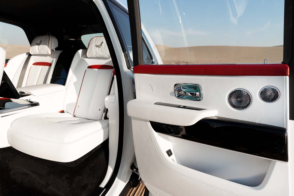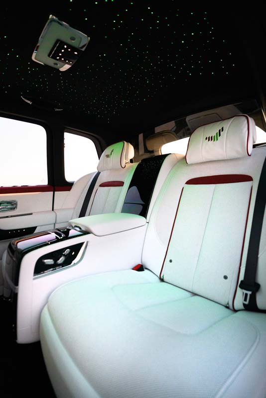 The exterior is finished in Crystal over Arctic White, adorned with a hand-painted double coachline – the upper line in Hotspur Red, the lower Fame Green. The effect is completed with a Gold Bullion Coachline Motif, the national flag rendered in Hotspur Red, Fame Green and Black on the C-Pillar Motif, and a double wheel-centre pinstripe to represent the National Flag of the UAE.