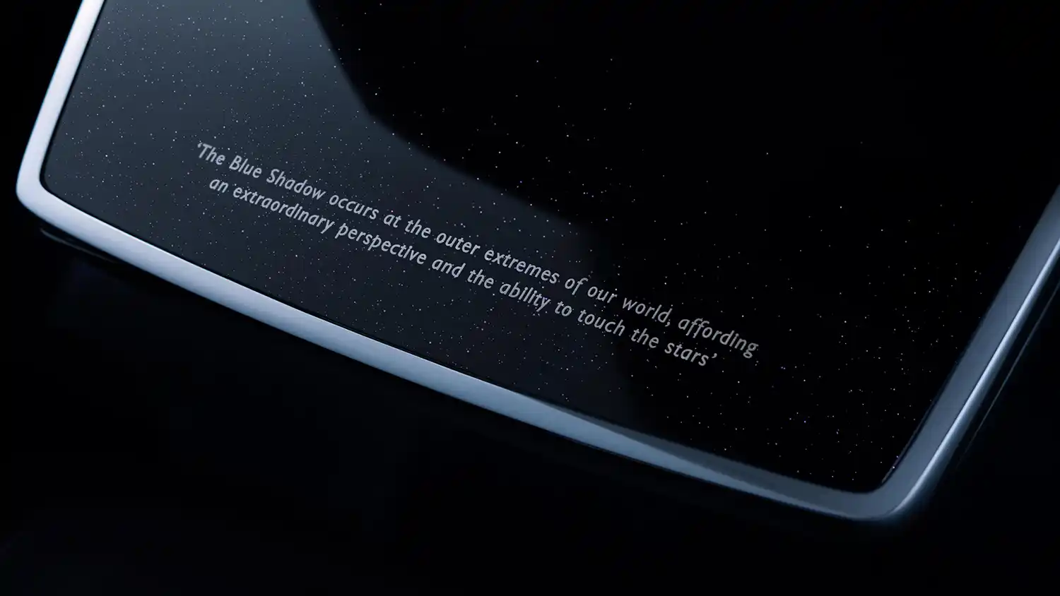 The seats’ perforation pattern is extended to the picnic table backs. Once lowered, the picnic tables themselves are finished in Piano Black veneer and incorporate a glass sparkle finish, evoking the view into the darkness of space. Each table also includes the Collection theme text, inlaid in polished aluminium beneath the top lacquer layer – ‘The Blue Shadow occurs at the outer extremes of our world, affording an extraordinary perspective, and the ability to touch the stars’.