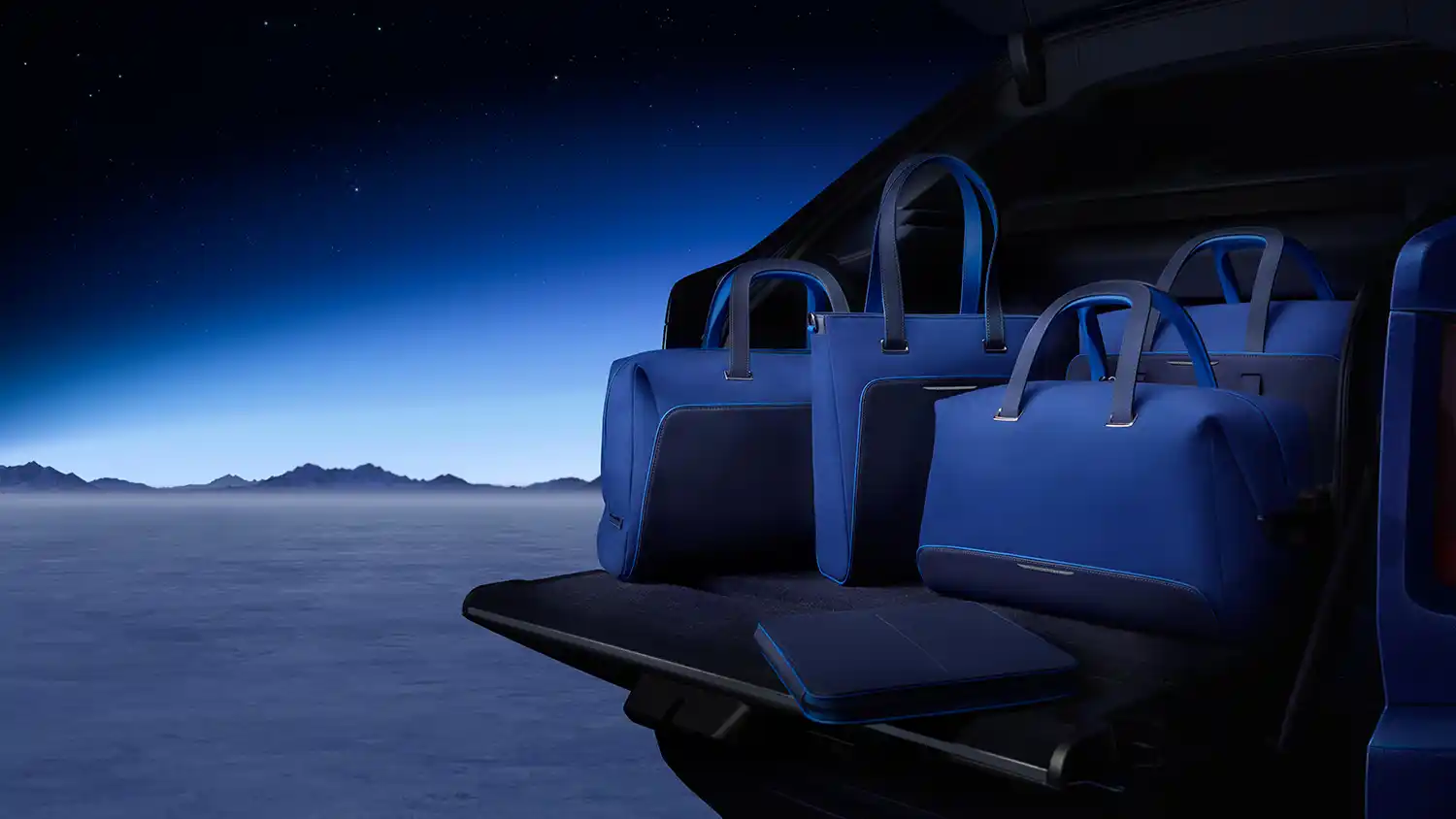 The Rolls-Royce Bespoke Collective created a series of unique accessories to complement Black Badge Cullinan Blue Shadow. The exclusive indoor car cover echoes the pattern seen on the seats. To accompany the driver and passengers on their adventures, there is a unique luggage set that continues the Private Collection’s colourway. Clients can also commission an exact 1:8 scale replica of their full-size Black Badge Cullinan Blue Shadow, featuring fully functioning exterior and interior lights, opening and closing coach doors and an interior recreating all the Collection details, including the Bespoke Illuminated Collection Treadplates.