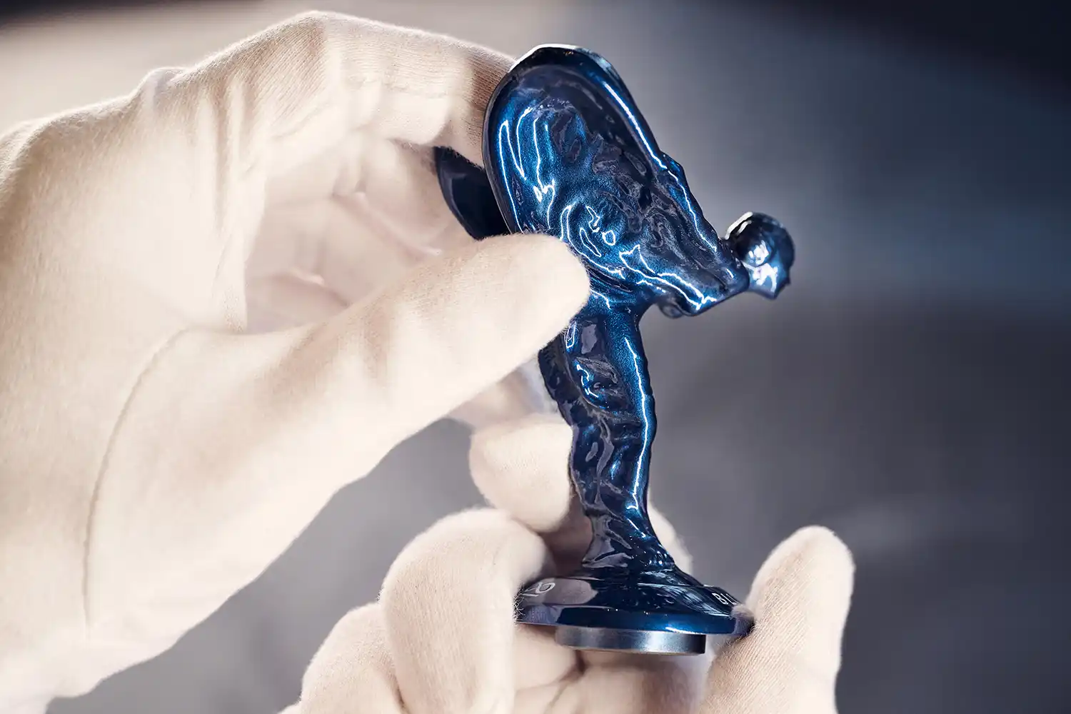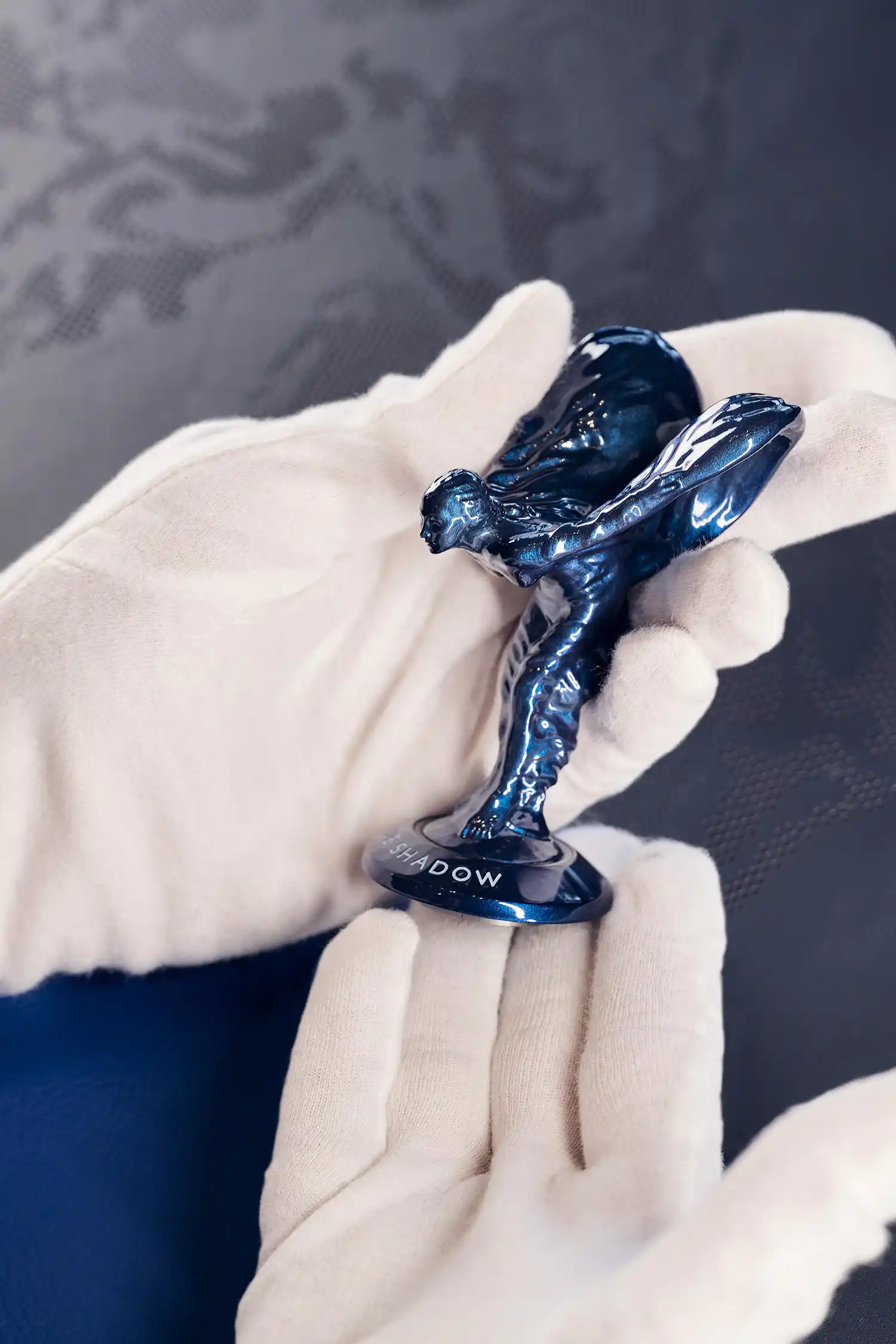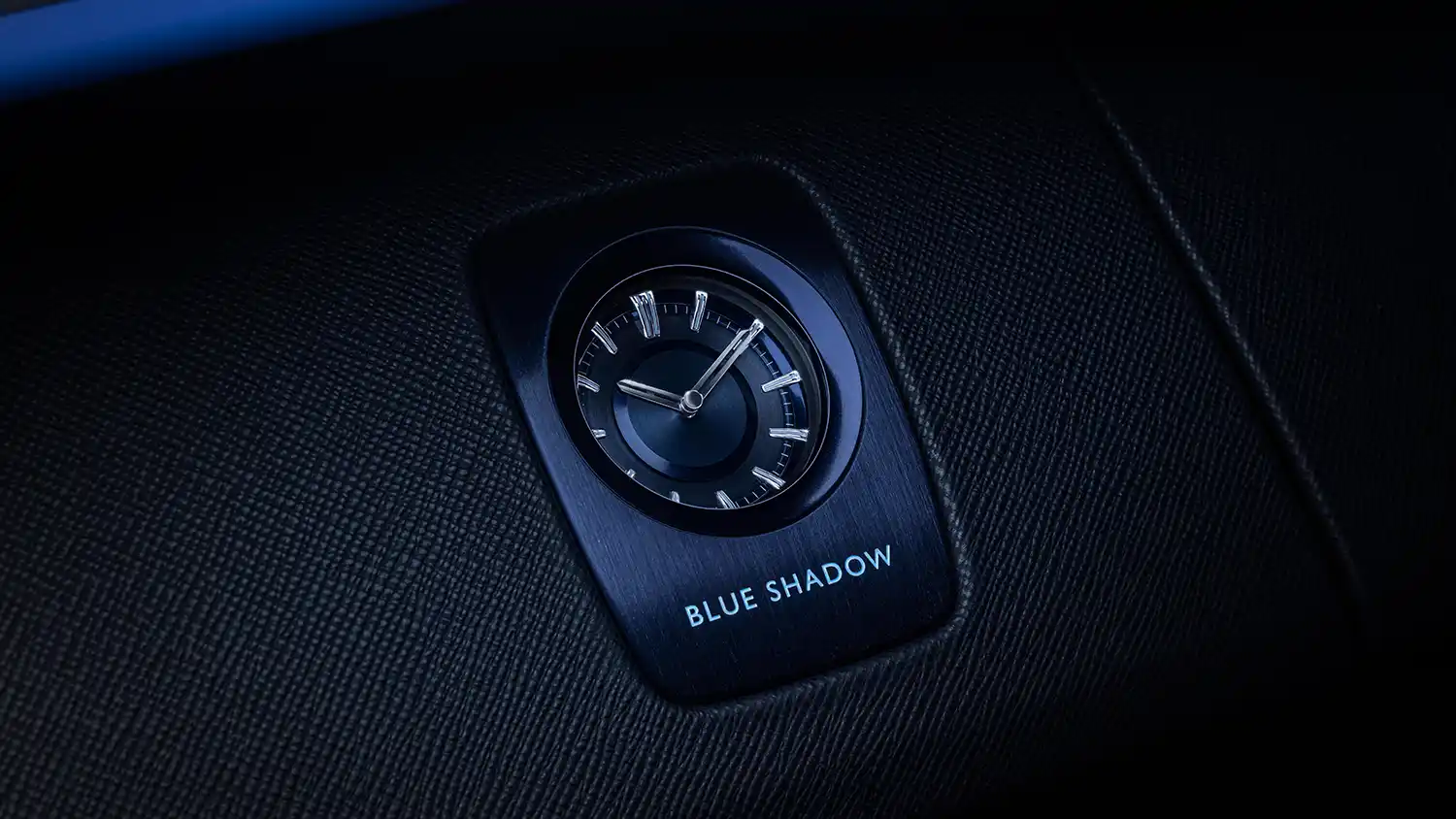 Drawing further from the materials used in spacecrafts, the Spirit of Ecstasy is created using 3D printing techniques in titanium and finished with a thin layer of blue-tinted lacquer which adds pearlescence while revealing the titanium’s grained texture. The Black Badge infinity logo and ‘Blue Shadow’ Private Collection name are engraved on the Spirit of Ecstasy base and infilled with Charles Blue. Completing the exterior aesthetic, Blue Shadow’s wheels are subtly darkened using a translucent lacquer.
