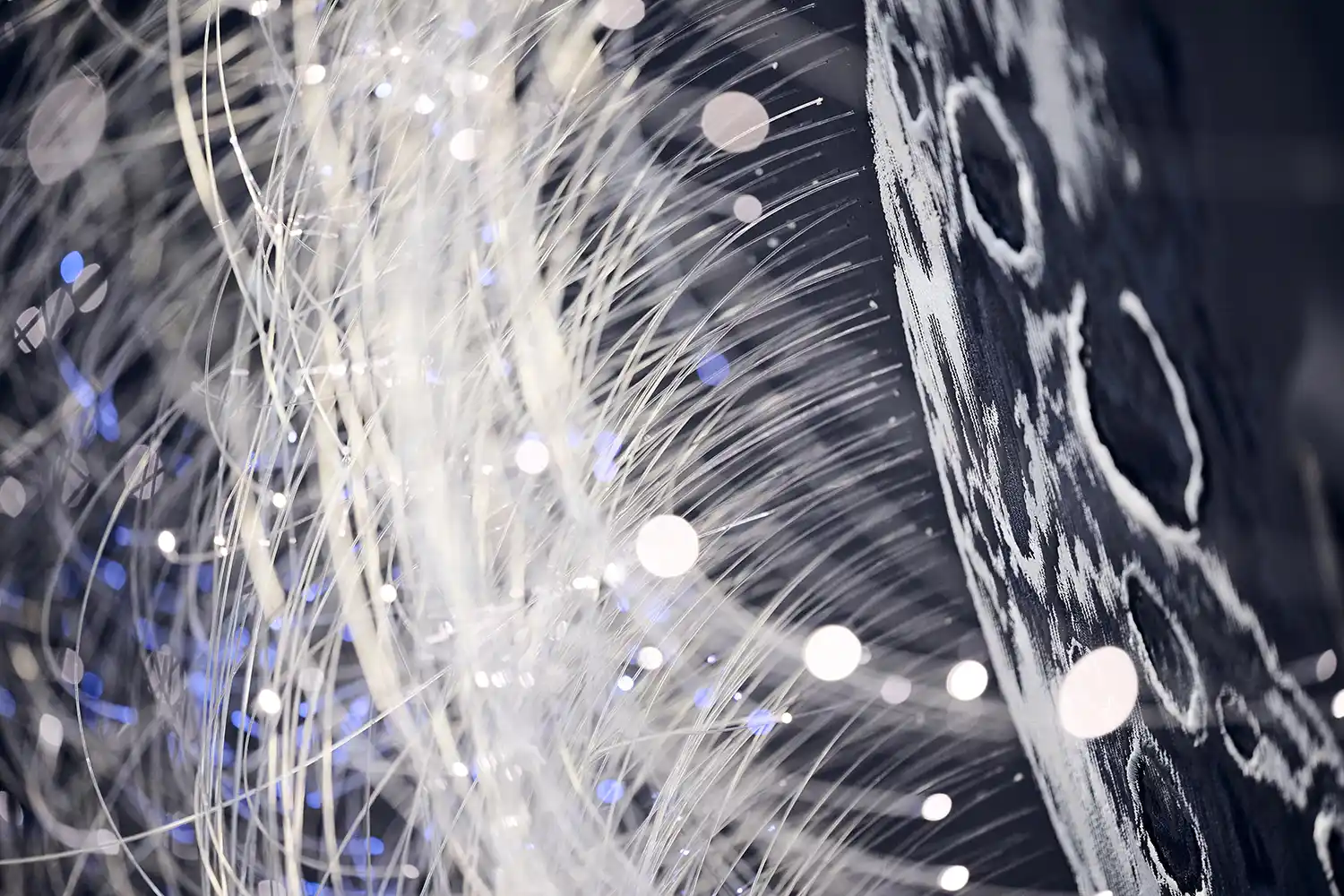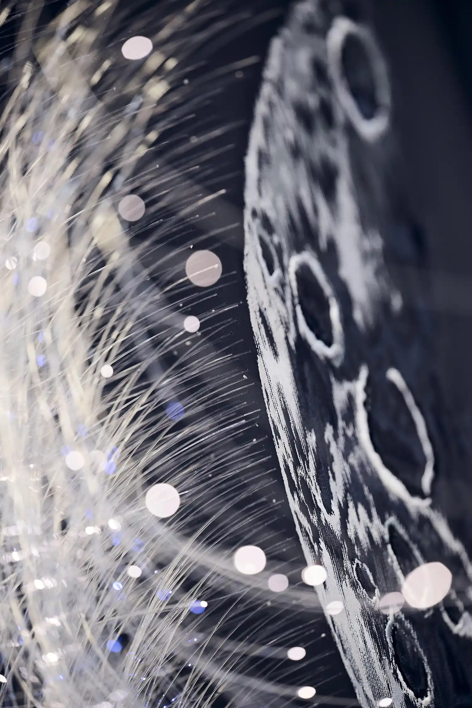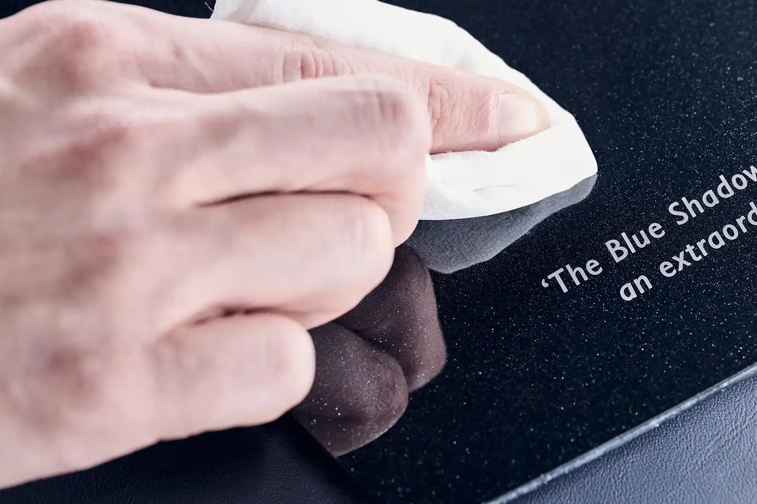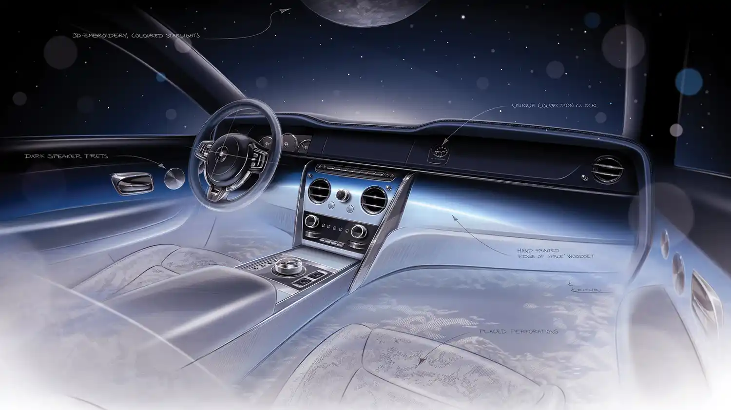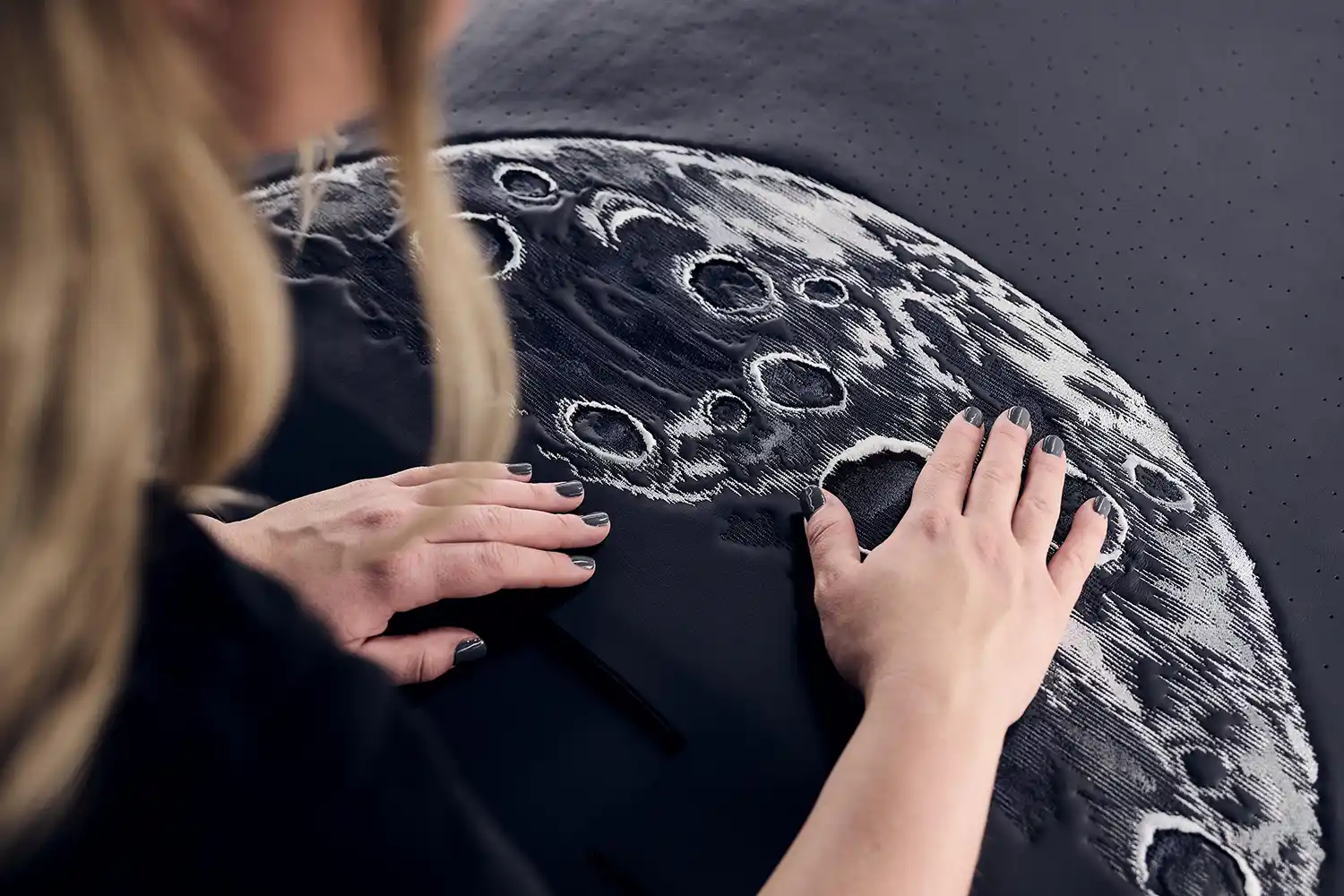 With ‘Blue Shadow’, Rolls-Royce have taken the marque’s fabled Starlight Headliner to an even more stellar level: an intricate Moon embroidery, surrounded by an array of ‘stars’, teleports the passengers to the edge of space. Representing the Moon’s surface with its multitude of craters in three dimensions, the embroidery incorporates five different colours of thread, each applied with a different technique to produce a distinctive texture. In total, the embroidery is created from 250,000 separate stitches – a process that takes two entire days to complete.