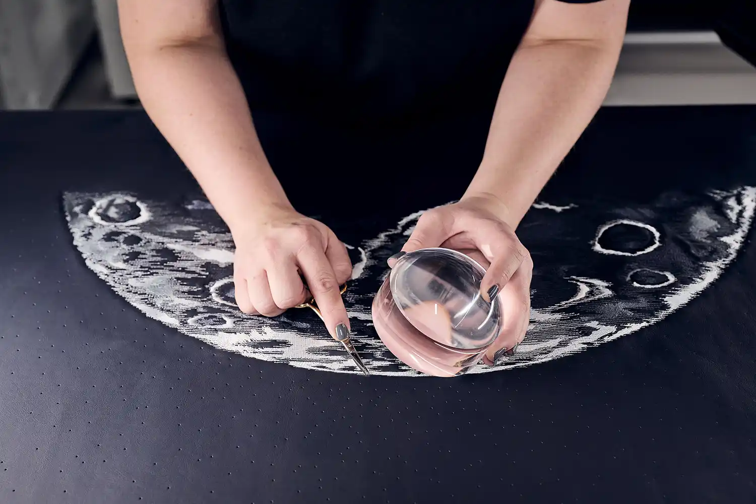 These perforations are made in two different sizes: the smaller (just 0.8 mm in diameter) form the land, while the slightly larger (1.2 mm) define the sea; the blank spaces of leather in between represent the clouds. Each seat has over 75,000 perforations, all individually placed. The pattern took two weeks to design and underwent five trials before it attained the exceptional level of quality required by the Rolls-Royce Bespoke Collective. The result is perfect alignment of the design, ensuring a cohesive, uniform appearance across all four seats.