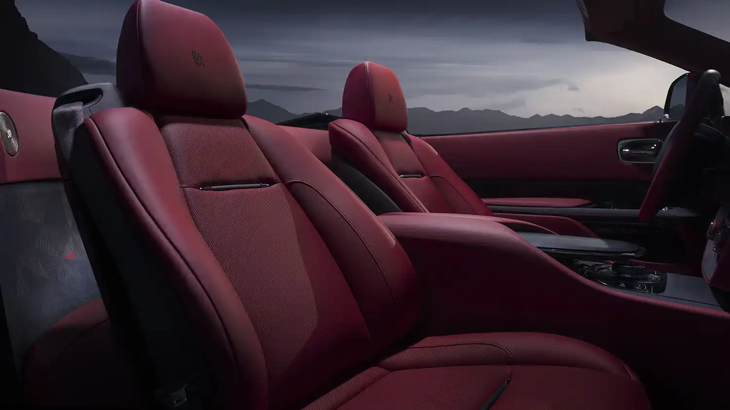 Rolls-Royce La Rose Noire Droptail is inspired by the allure of the Black Baccara rose, an intense, velvet-like flower that originates in France and is beloved by the mother of the commissioning family. The dark pomegranate colour of its petals appears almost black in shade, but in direct light, a red, pearlescent shimmer is revealed on the dark surface. These two colours form the primary palette of La Rose Noire Droptail. The first red shade is named ‘True Love’ in recognition of the romance the client wished to capture in this commission. The darker tone is named ‘Mystery’, inspired by the mysterious nature of the rose, which appears to change colour when viewed from different angles. Indeed, it was the essence of true love and the mystery of exploration and travel that captivated the clients throughout the commissioning process.