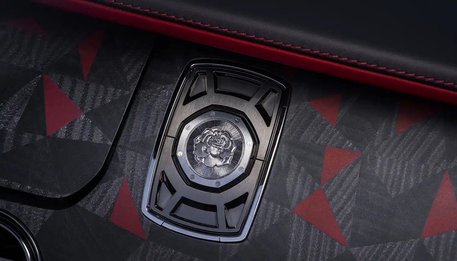 The fascia of Rolls-Royce La Rose Noire Droptail is provisioned with an integrated one-off timepiece by Audemars Piguet, which was specially commissioned by the client. The 43mm Royal Oak Concept Split-Seconds Chronograph GMT Large Date is powered by a unique self-winding Calibre 4407 movement, featuring a flyback chronograph and a split-seconds mechanism. Masterfully matched to La Rose Noire’s colourway, it incorporates red counters and a red inner bezel, providing a bright contrast to the black ‘openworked’ dial highlighted with rhodium-toned bevels.