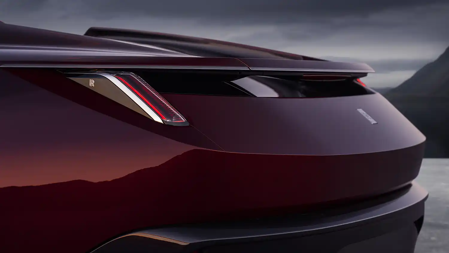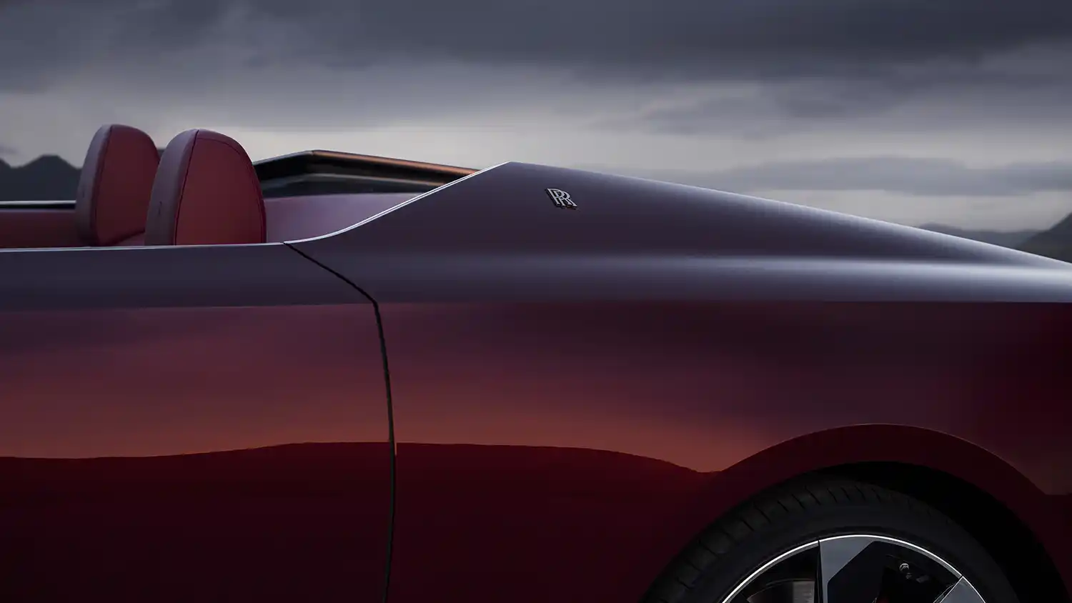 A significant exterior element is the treatment of the striking alloy wheels, which feature the dark Mystery paint finish. Like the flower itself, from afar the finish appears to be black, but upon closer examination, the sunlight reveals shimmering dark red undertones. The Mystery paint is applied to the entire surface of the rim and then, through a high-precision diamond milling process, areas of the paint are removed to expose accents of the base alloy material that are then polished. This treatment emphasises the directional nature of the wheel and its bold 22-inch size, underpinning this Droptail’s formidable personality.
