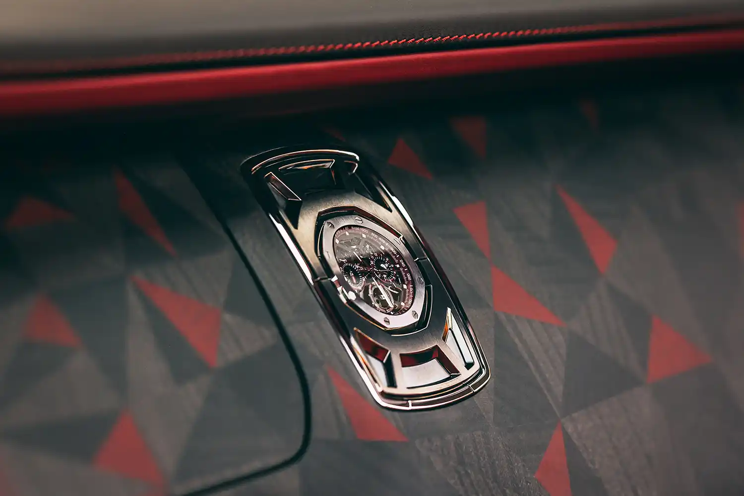Integrating the timepiece presented a significant challenge: the clients requested that it should both be mounted in the motor car and also be removable, so that it can be attached to a strap and worn. This was realised with a powered clasp mechanism that gently presents the timepiece at the touch of a button.