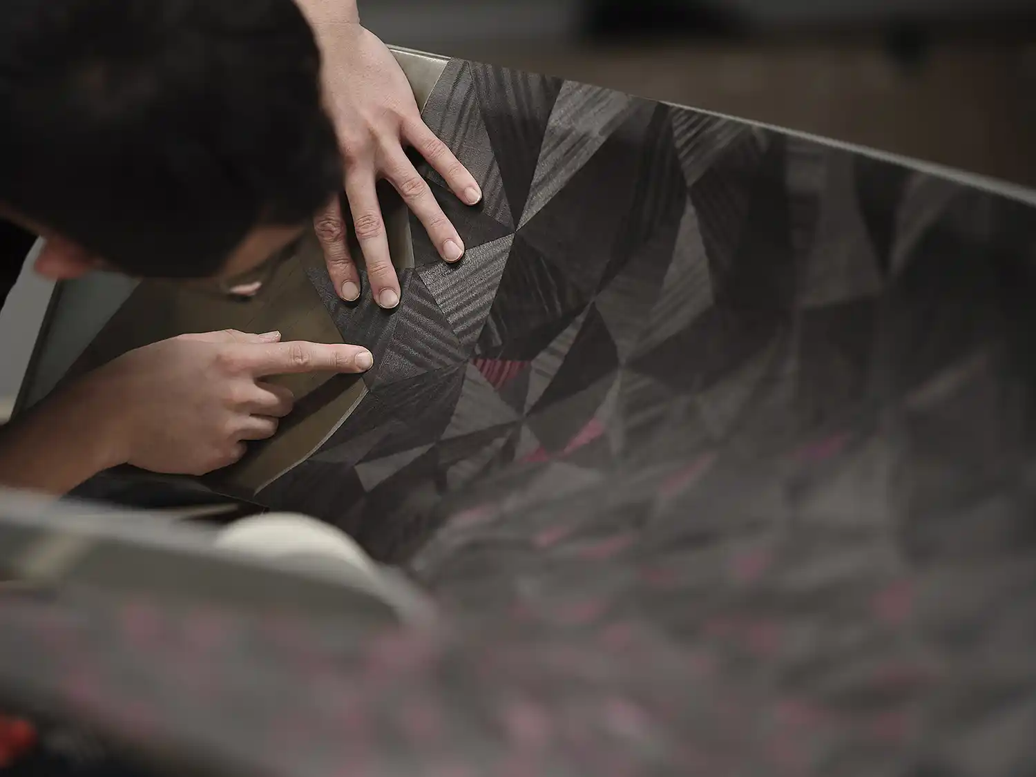 Made from Black Sycamore wood sourced in France as a subtle tribute to the French provenance of La Rose Noire, each triangle is cut, sanded and precisely positioned by hand. The pieces that appear to be stained light and dark grey are in fact presented in their natural hue; the colour difference is achieved by using veneer from several logs with different ‘figures’ – the natural pattern on the veneer. Paint was used only to create the red pieces – to avoid the colour fading over time, the marque’s artisans spent a year developing a new lacquer formula to protect this extraordinary projection of contemporary craft.