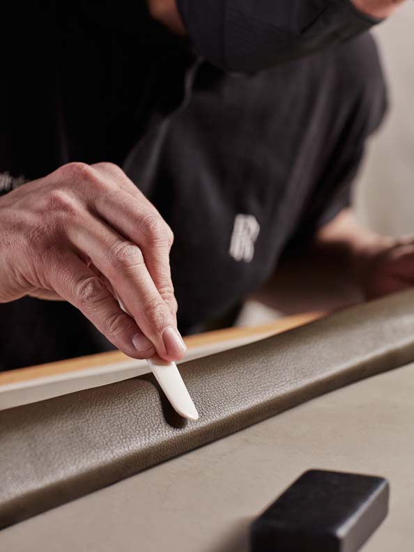 The Hermès leather flows around the upper instrument panel, interior pillars and parcel shelf. It also enrobes less visible surfaces including the glove compartment and luggage compartment lining, centre console, decanter stowage compartment and Champagne cooler. In a sign of the project’s truly collaborative nature, and the two makers’ mutual esteem, the glove compartment lid is embossed with the signature Habillé par Hermès Paris.