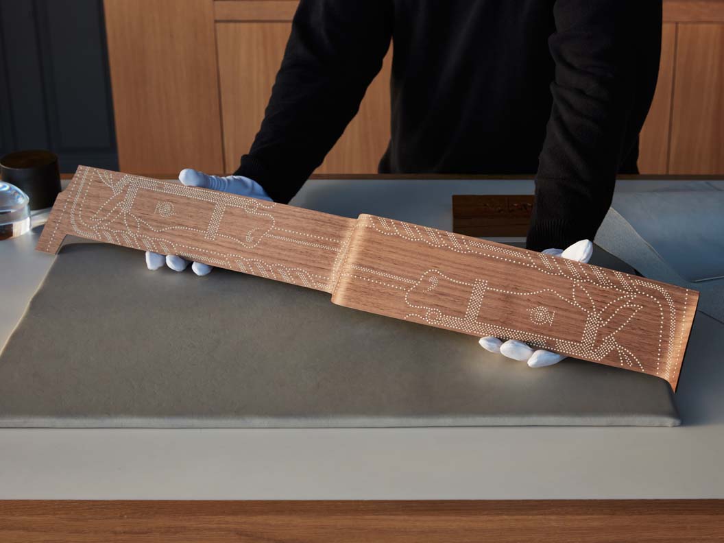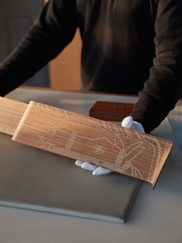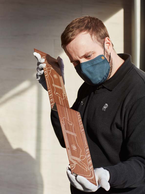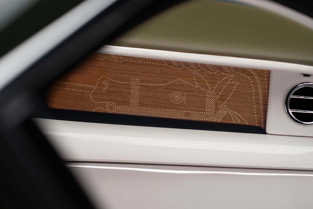 Hermès brings its distinctive equestrian heritage and innovative craftsmanship know-how to the car, with the leather upholstery created using stitching and edge-painting techniques originally employed by master saddlers. For Phantom’s Gallery, a feature unique to Rolls-Royce, that runs the length of the motor car’s fascia, Hermès commissioned an artwork based on a design by the celebrated French artist and illustrator Pierre Péron (1905–1988) who created many of the House’s iconic scarves. The work, inspired by the famous Hermès horse motif, is hand-painted on Open Pore Royal Walnut and is presented as though staged in an art gallery, behind glass.