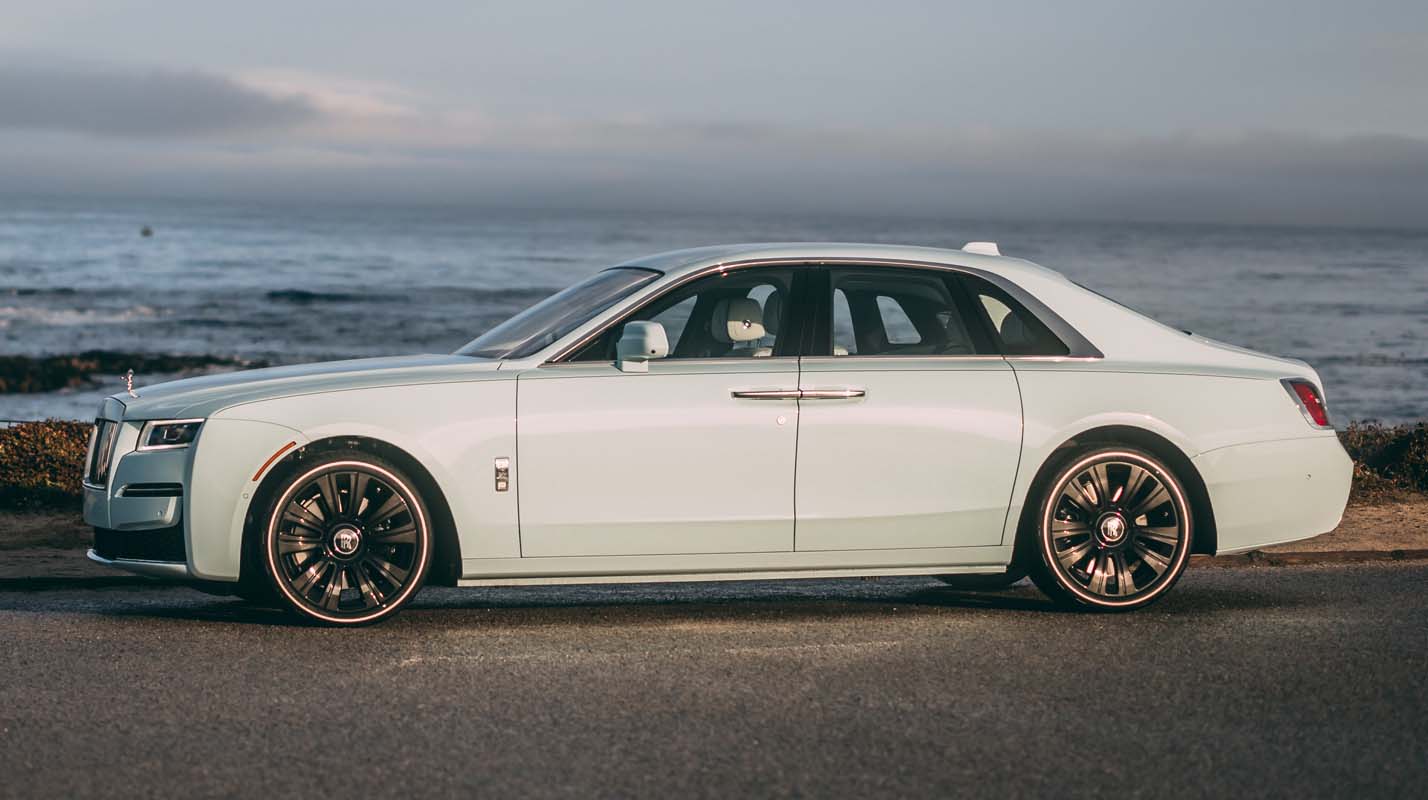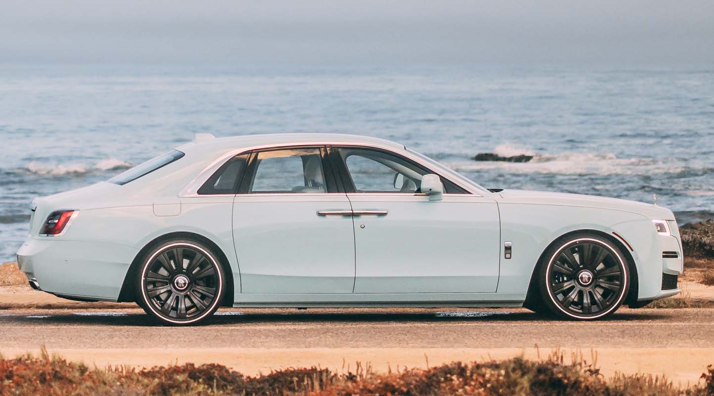 Complementing this colourful Cullinan is another world premiere in Rolls-Royce Bespoke colour finish, Ghost in Crystal over Sagano Green. Created with six layers of finish, highly skilled artisans from the marque’s Exterior Surface Finish Centre spent hours meticulously hand-polishing each layer. Before the final two clear coatings are completed, the Crystal finish is applied with minute particles of colour specks to create a lustrous, multi-dimensional shimmer on Ghost’s post-opulent design. Running the length of the exterior is a hand applied coachline that beautifully complements the pinstripe tyres on gloss black painted wheels. The hours of hand polishing are inspected in a specially designed light booth to ensure a perfect finish before this Ghost was delivered to Monterey.