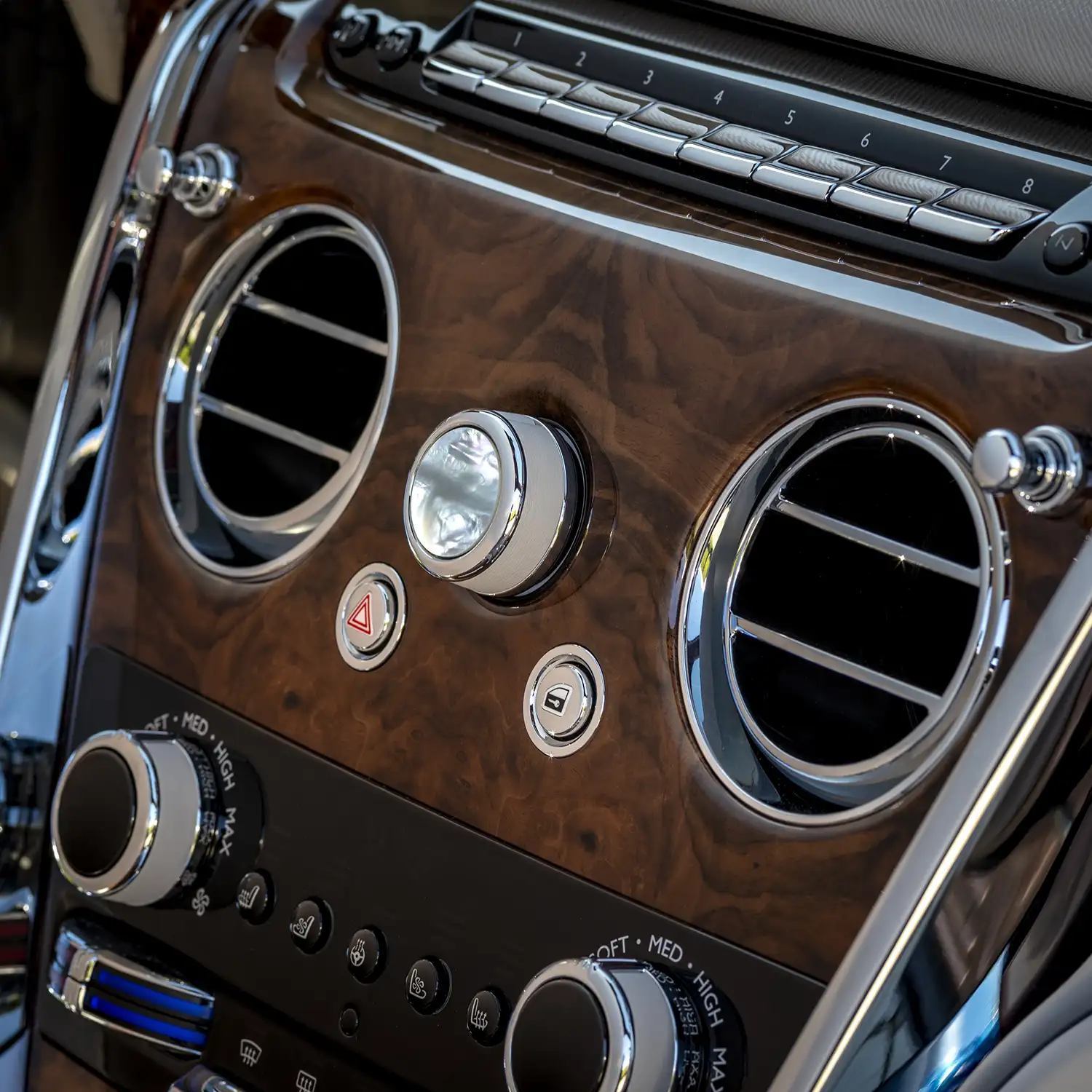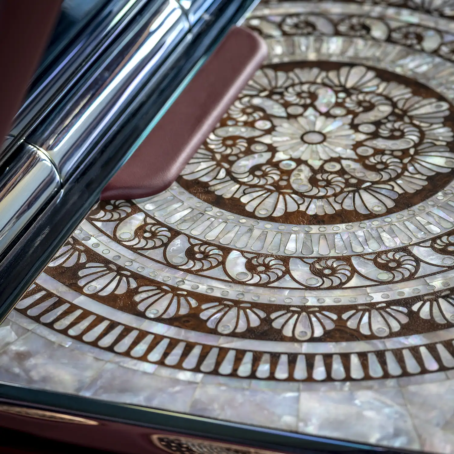 This is particularly apparent with the detailed design of the Picnic Tables, fitted to the rear of the front passenger seats. The upper surface features an intricate, circular pattern inspired by traditional Arabic design that draws the eye inwards to a central point. Each tabletop is then inlaid with 1,351 separate pieces of mother-of-pearl, every one individually selected and placed by hand in the surrounding burr walnut marquetry and sealed with clear lacquer. The natural shade and colour differences in both the mother-of-pearl and the wood mean each tabletop is a unique work of art.
