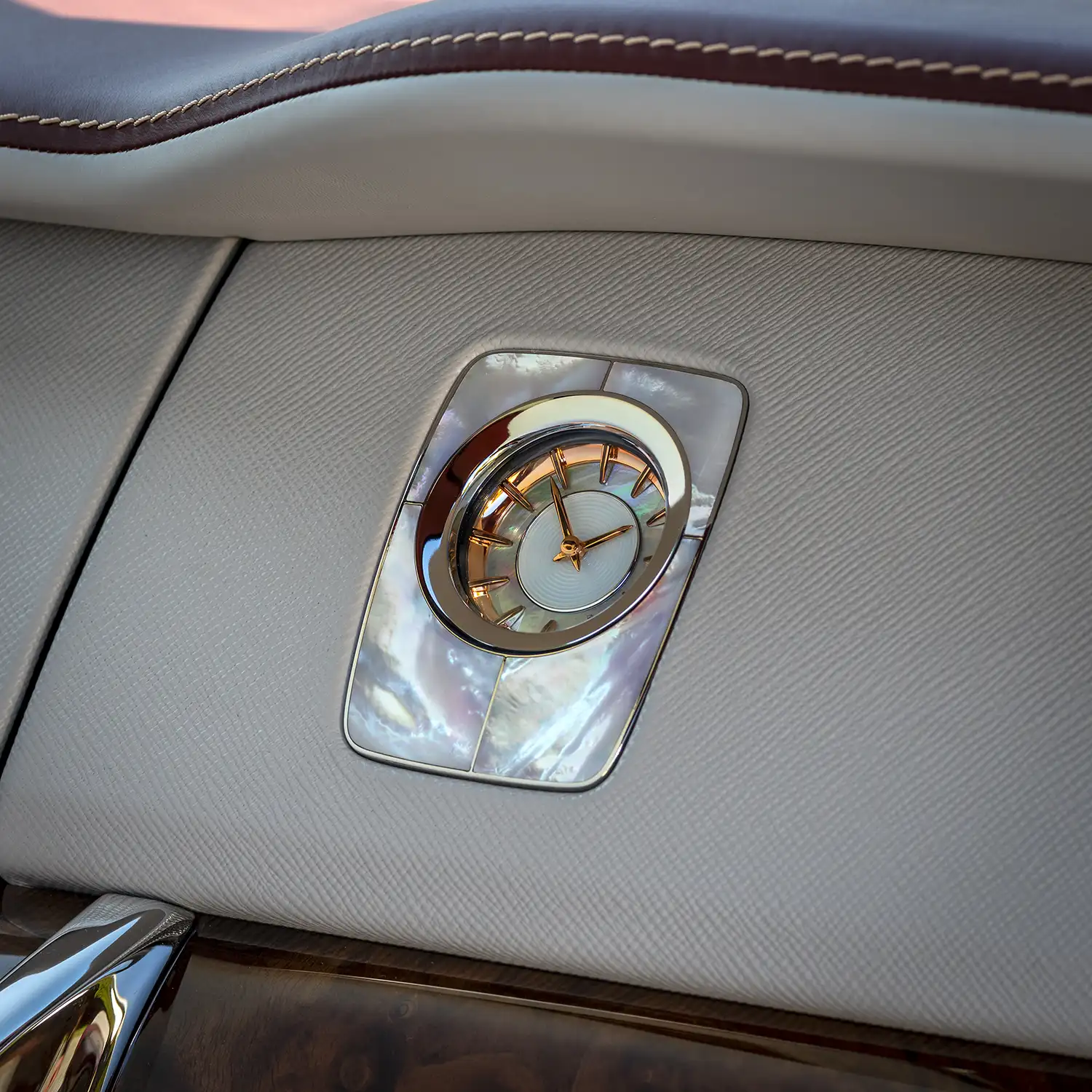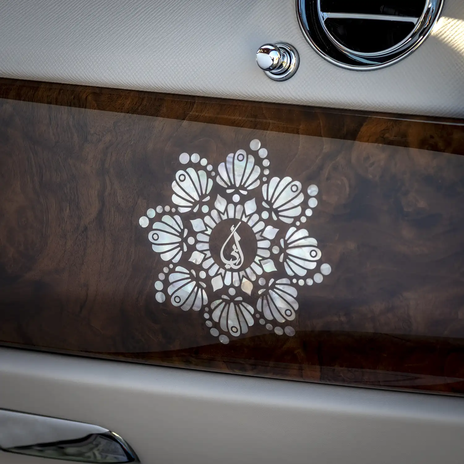 The burr walnut fascia incorporates an exquisite mother-of-pearl inlay inspired by traditional Middle Eastern art. At its centre is the Arabic word for ‘father’, inlaid in stainless steel. In a first for Rolls-Royce, the Bespoke dashboard clock is set in a mother-of-pearl surround; the dial and hands are in rose gold. The centre rotary dial is also finished with mother-of-pearl, giving it a tactile, jewel-like quality.