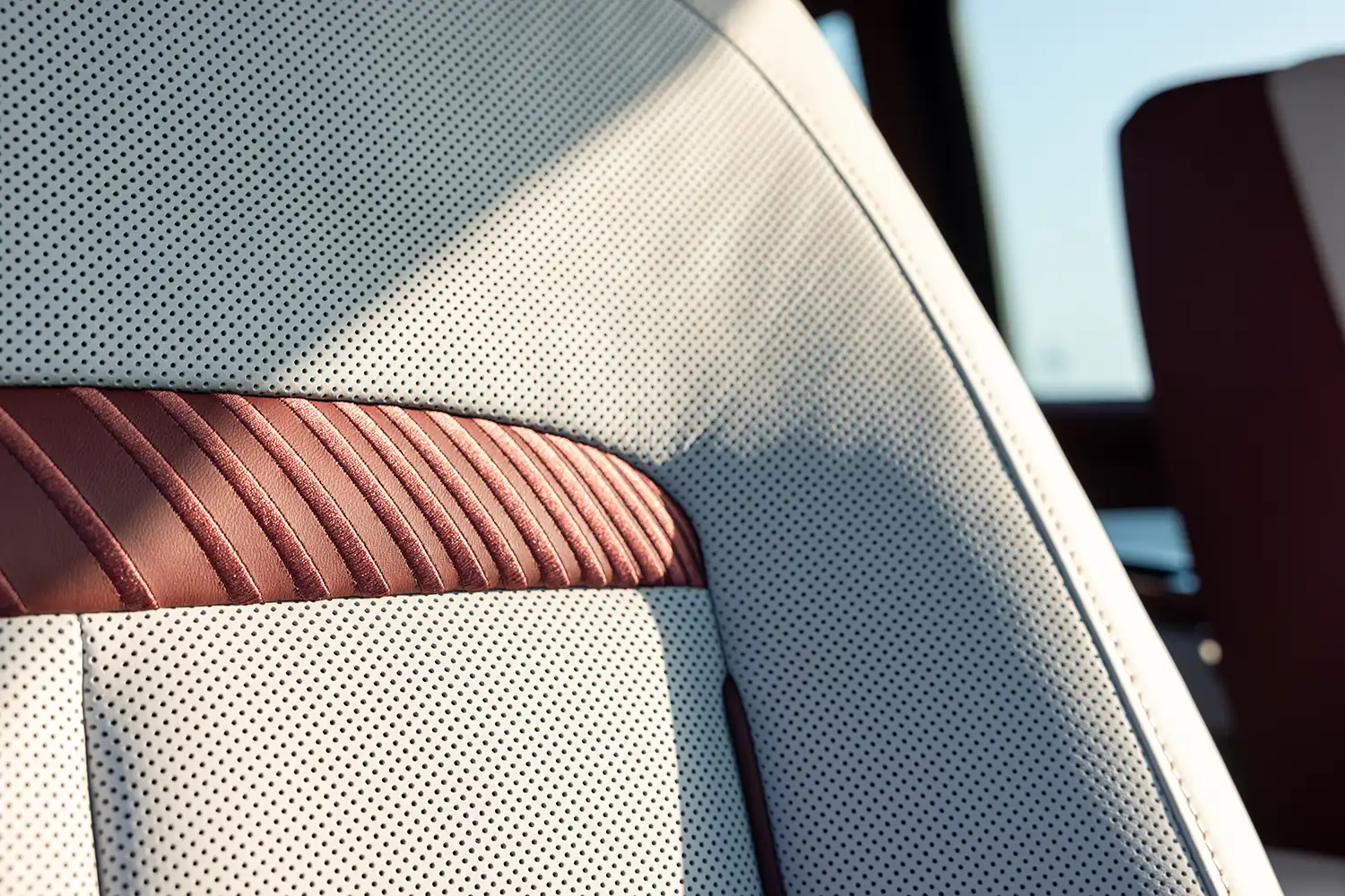Bespoke embroidery detailing includes ‘RR’ monograms in Rose Gold thread on the headrests, and rear seat inserts in Grace White, inspired by the symmetrical growth patterns of an oyster shell and angled at the same precise 55 degrees as the veneer.
