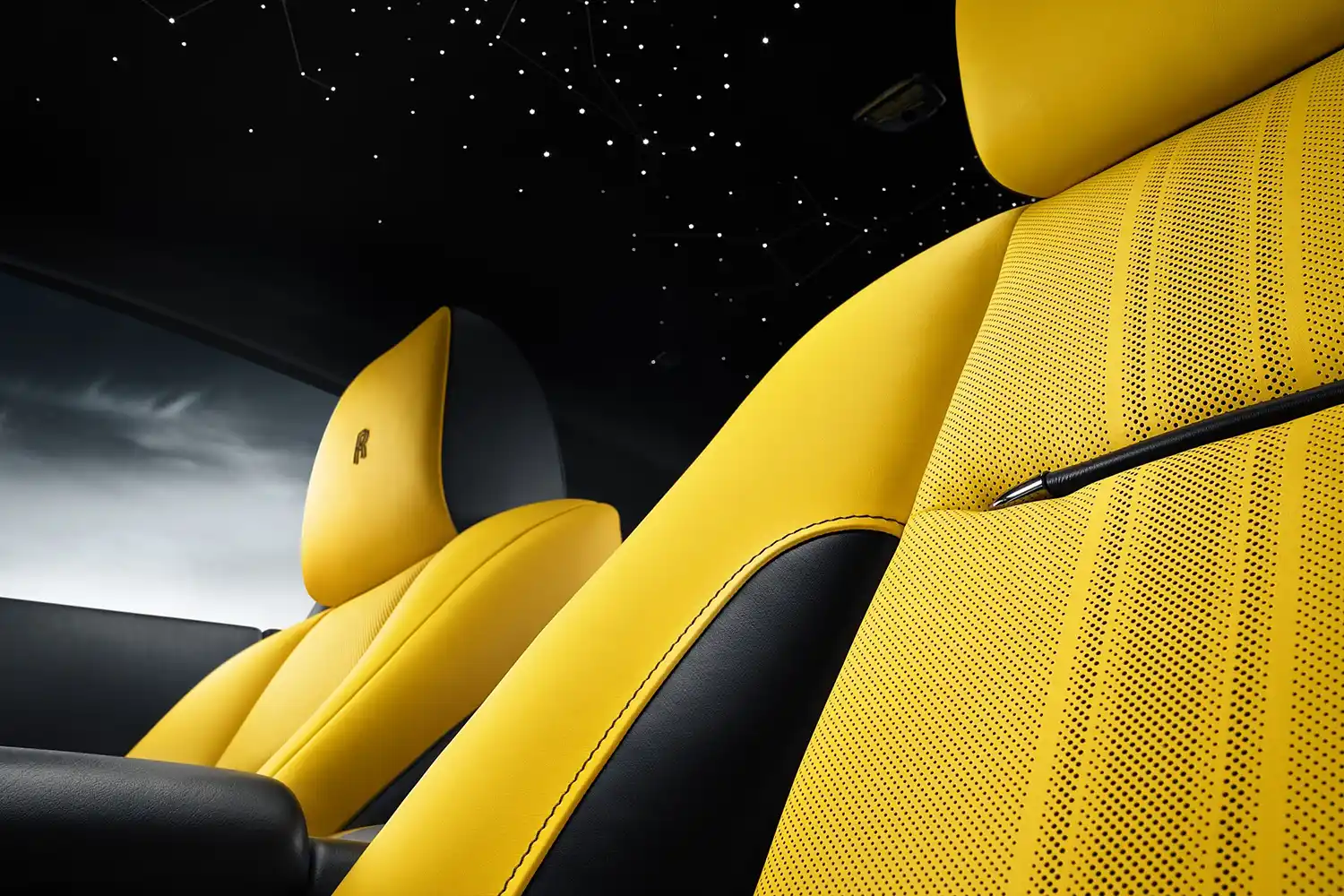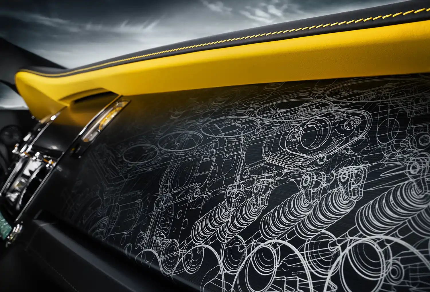 Contrast to the Gradient Paint is provided by Bright Yellow bumper inserts and Bespoke wheel pinstripes, subtly recalling the yellow circle within Thunderbolt’s black arrow. In another Rolls-Royce first, Black Arrow’s V-struts, located behind the radiator grille and in front of the engine, are also finished in Bright Yellow, subtly drawing the eye to the V12 engine behind the Black Badge dark chrome grille surround. This use of Bright Yellow extends to the base of the motor car’s layered carbon fibre Spirit of Ecstasy, which incorporates a Bright Yellow ring detail and an engraving of the Collection name.