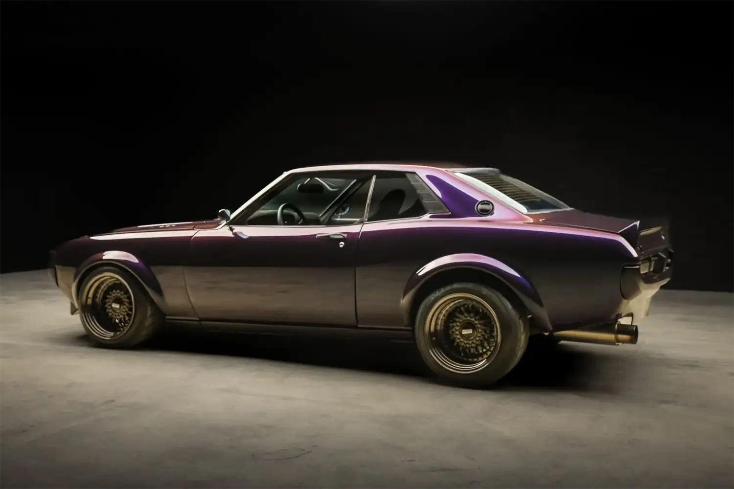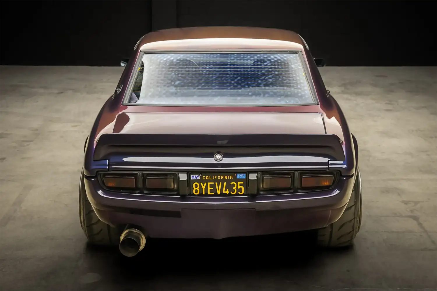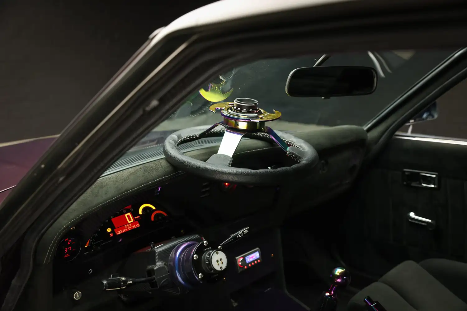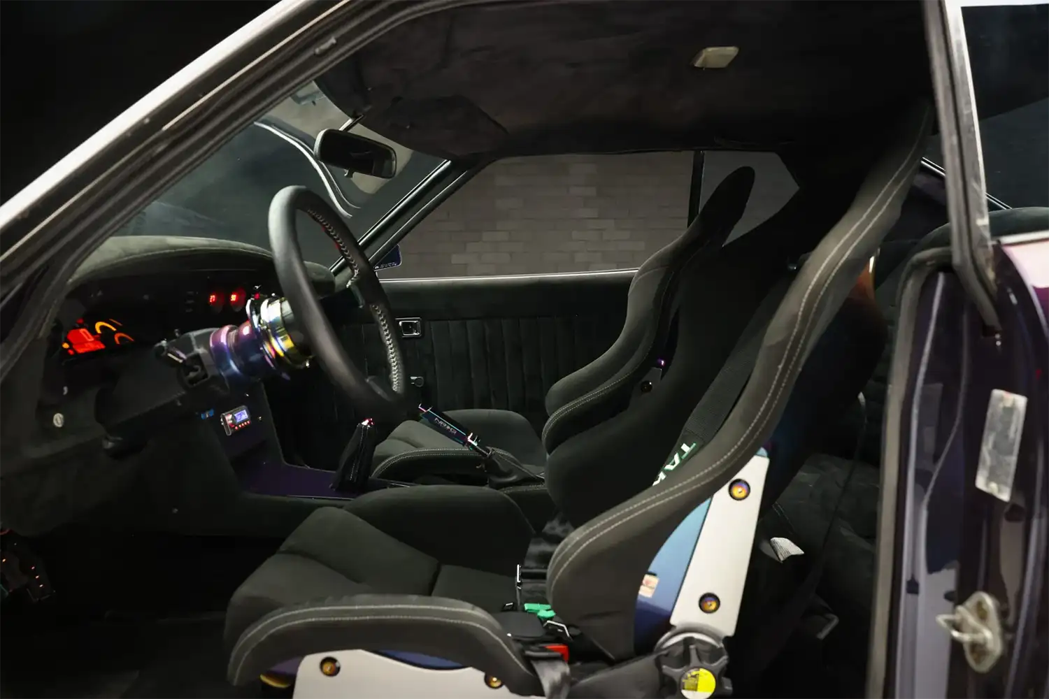 The car was stripped to a shell and walnut blasted prior to rust repair, the installation of fender flares, and a repaint in Nissan Midnight Purple III. Additional exterior details include TRD spoilers, fiberglass “smiley” bumpers, a lift-off hood with hold-down pins, carbon-fiber side mirrors, blacked-out trim, and an a-Spec titanium muffler.