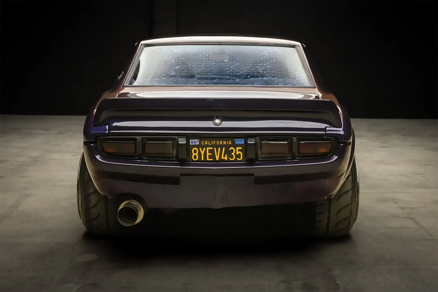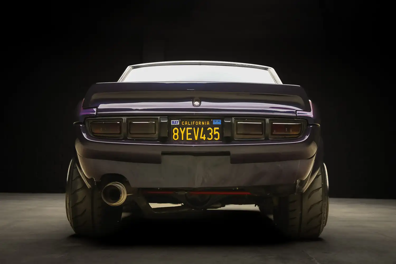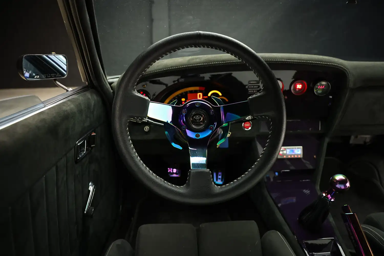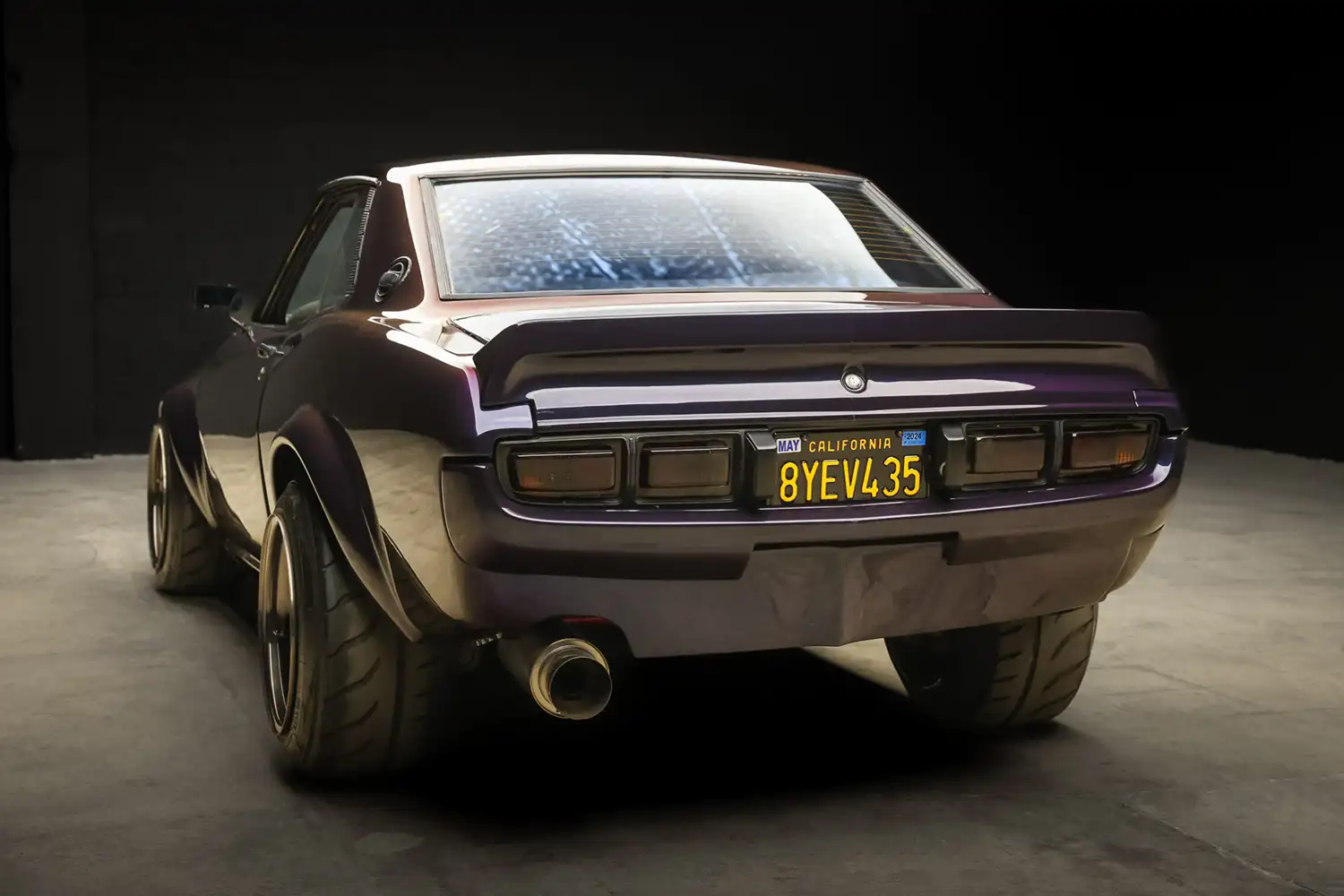 The car was stripped to a shell and walnut blasted prior to rust repair, the installation of fender flares, and a repaint in Nissan Midnight Purple III. Additional exterior details include TRD spoilers, fiberglass “smiley” bumpers, a lift-off hood with hold-down pins, carbon-fiber side mirrors, blacked-out trim, and an a-Spec titanium muffler.