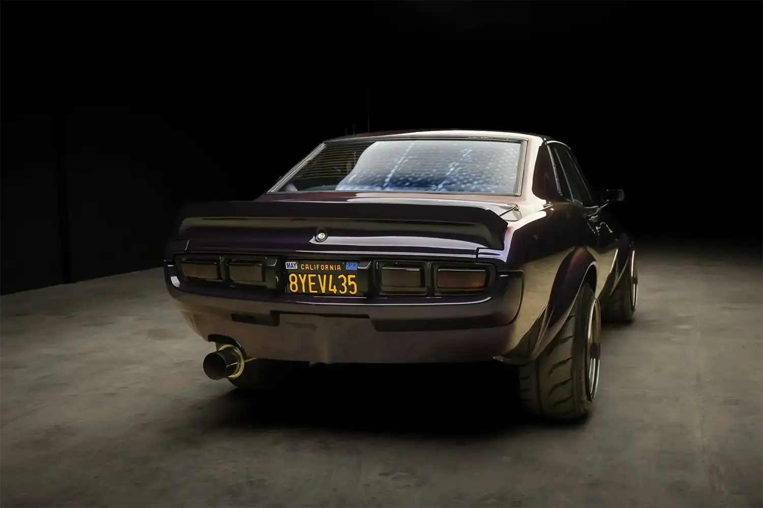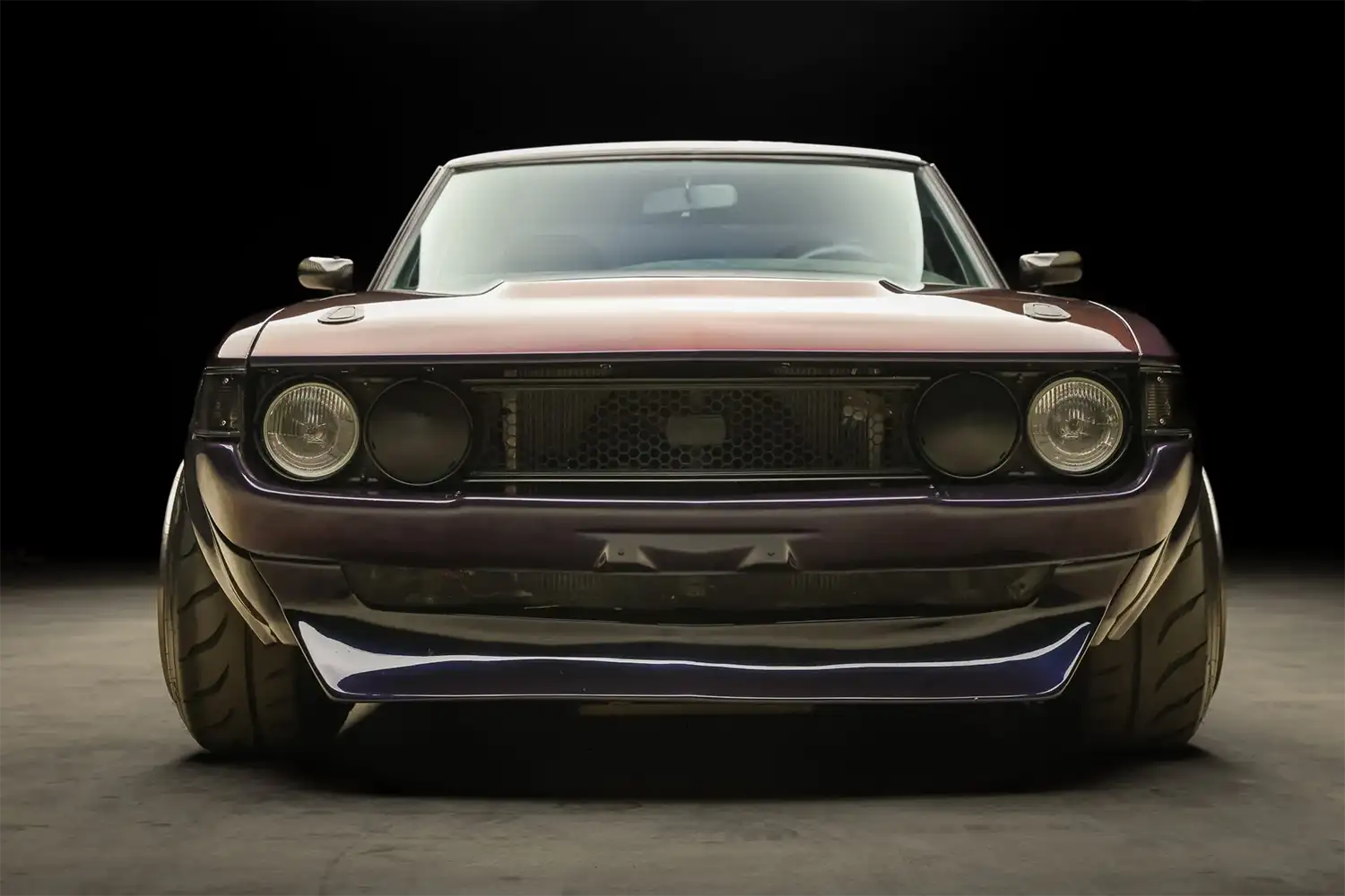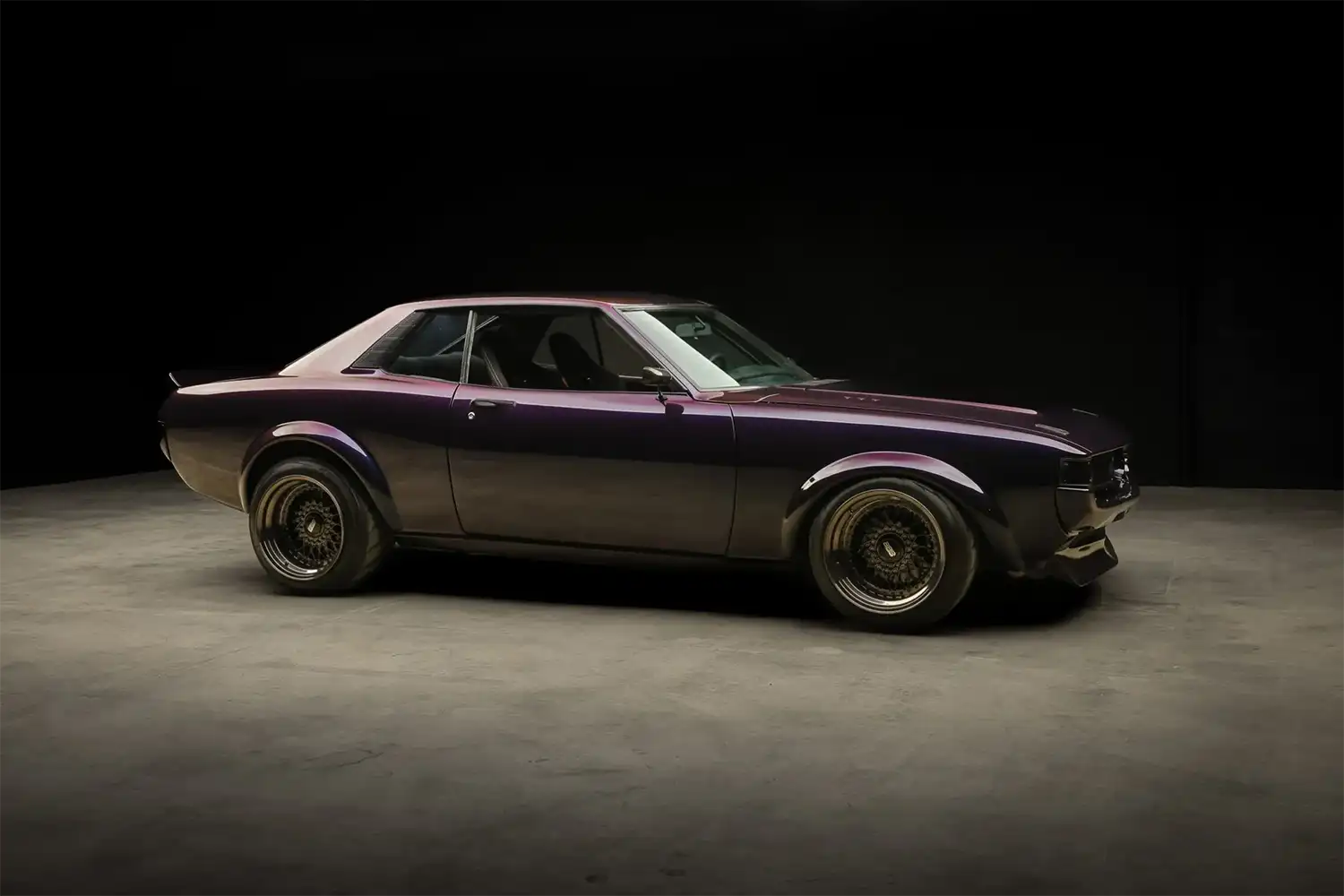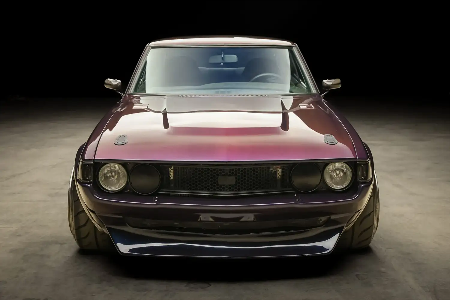 The car was stripped to a shell and walnut blasted prior to rust repair, the installation of fender flares, and a repaint in Nissan Midnight Purple III. Additional exterior details include TRD spoilers, fiberglass “smiley” bumpers, a lift-off hood with hold-down pins, carbon-fiber side mirrors, blacked-out trim, and an a-Spec titanium muffler.