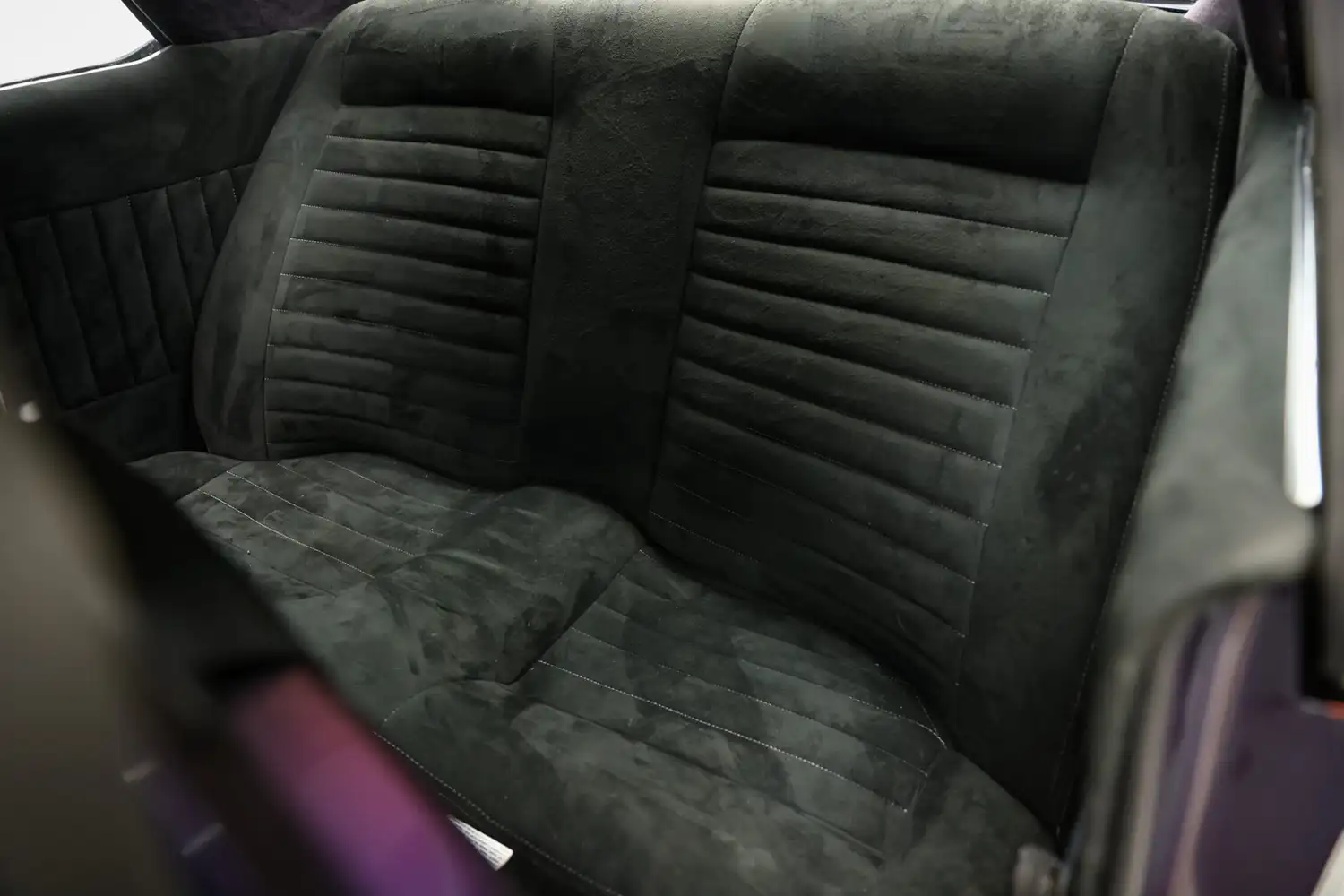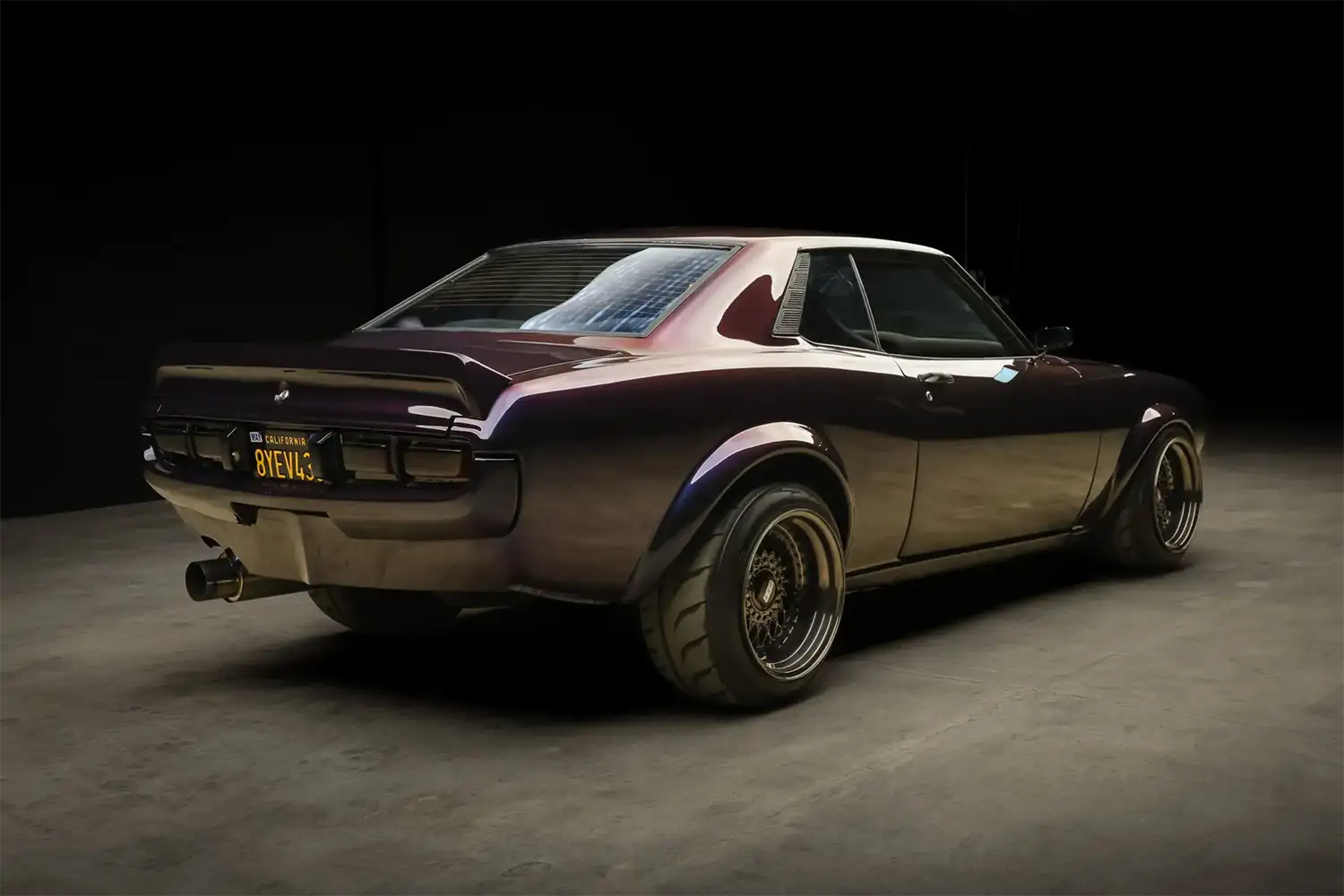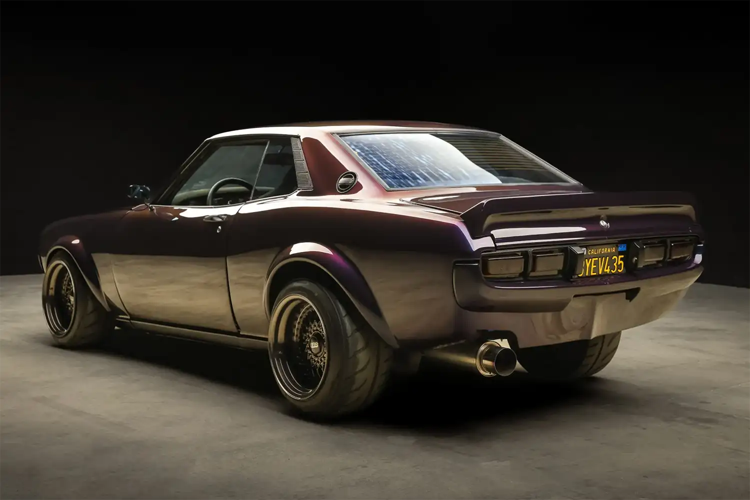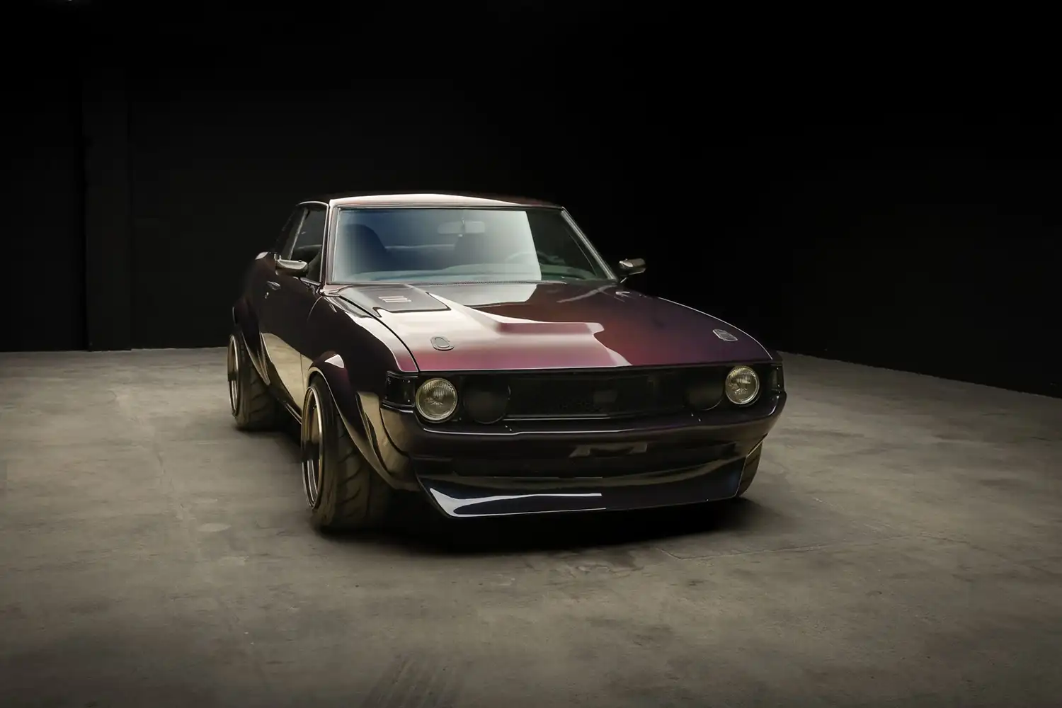 The car was stripped to a shell and walnut blasted prior to rust repair, the installation of fender flares, and a repaint in Nissan Midnight Purple III. Additional exterior details include TRD spoilers, fiberglass “smiley” bumpers, a lift-off hood with hold-down pins, carbon-fiber side mirrors, blacked-out trim, and an a-Spec titanium muffler.