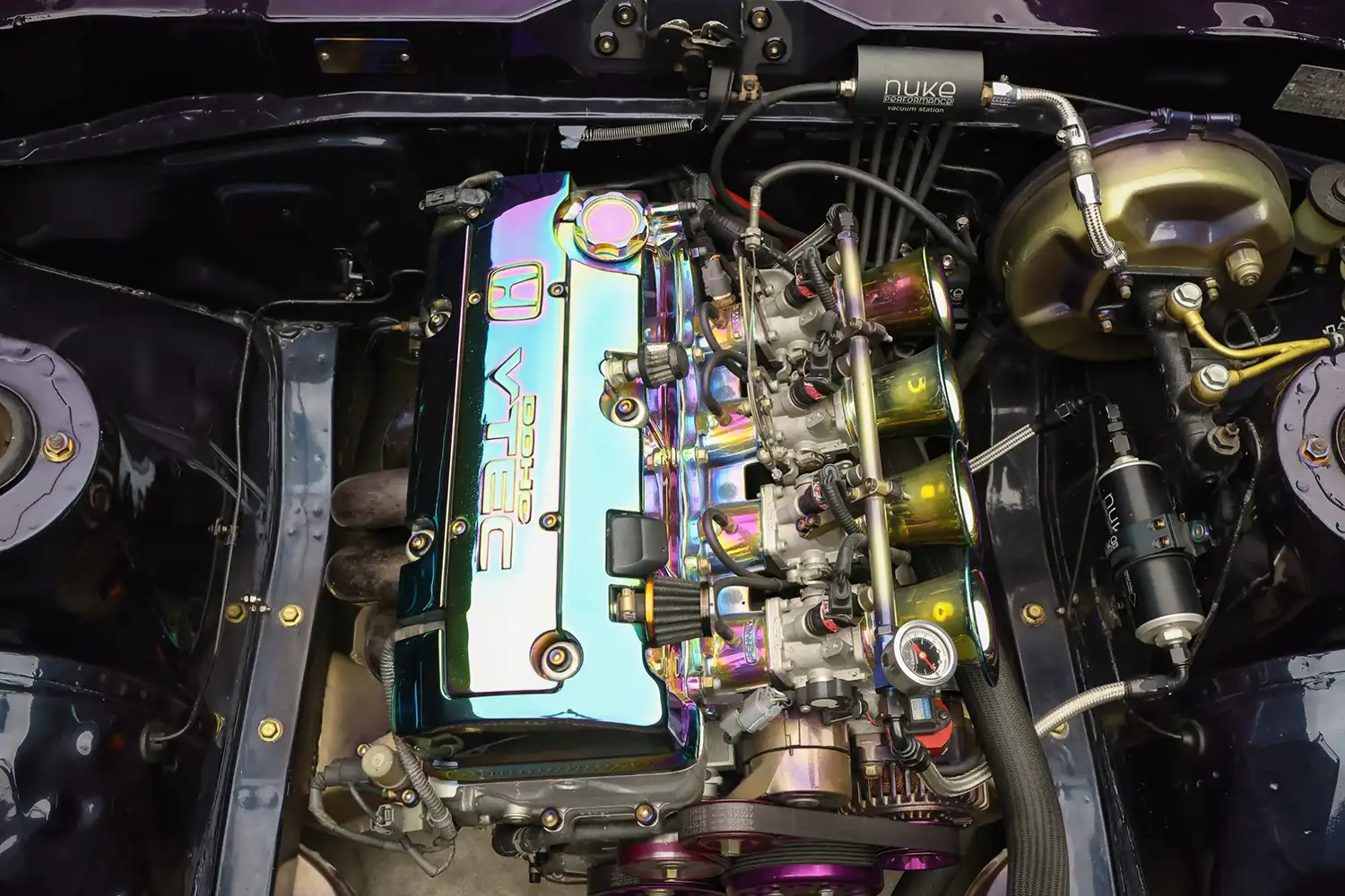The Honda S2000–sourced F22C inline-four is equipped with 48mm Jenvey throttle bodies, a J’s Racing tubular header, and a Koyo aluminum radiator. The six-speed manual transmission is also from an S2000, and the limited-slip rear end was reportedly sourced from a Corolla GT-S.