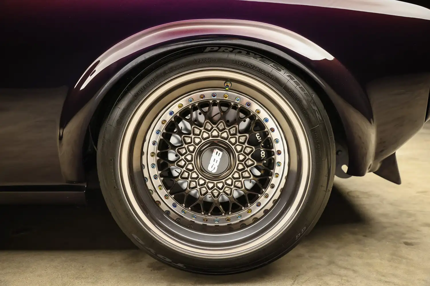 The 16″ BBS RS wheels were rebuilt with aftermarket lips and hardware and they are mounted with 195/50 and 245/45 Toyo Proxes R888R tires. Braking is handled by Wilwood four-wheel discs, and the car’s suspension has been modified with AccuAir air springs, a VU4 air manifold, a chrome compressor, and an e-Level controller as well as Bilstein gas shocks, Addco sway bars, and polyurethane bushings.