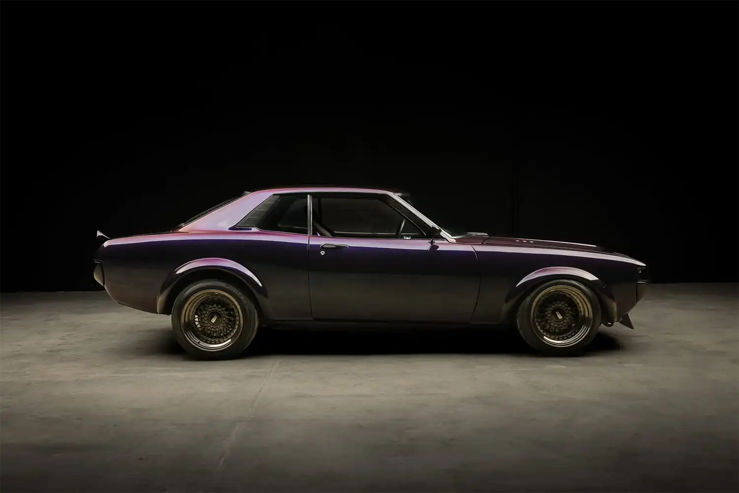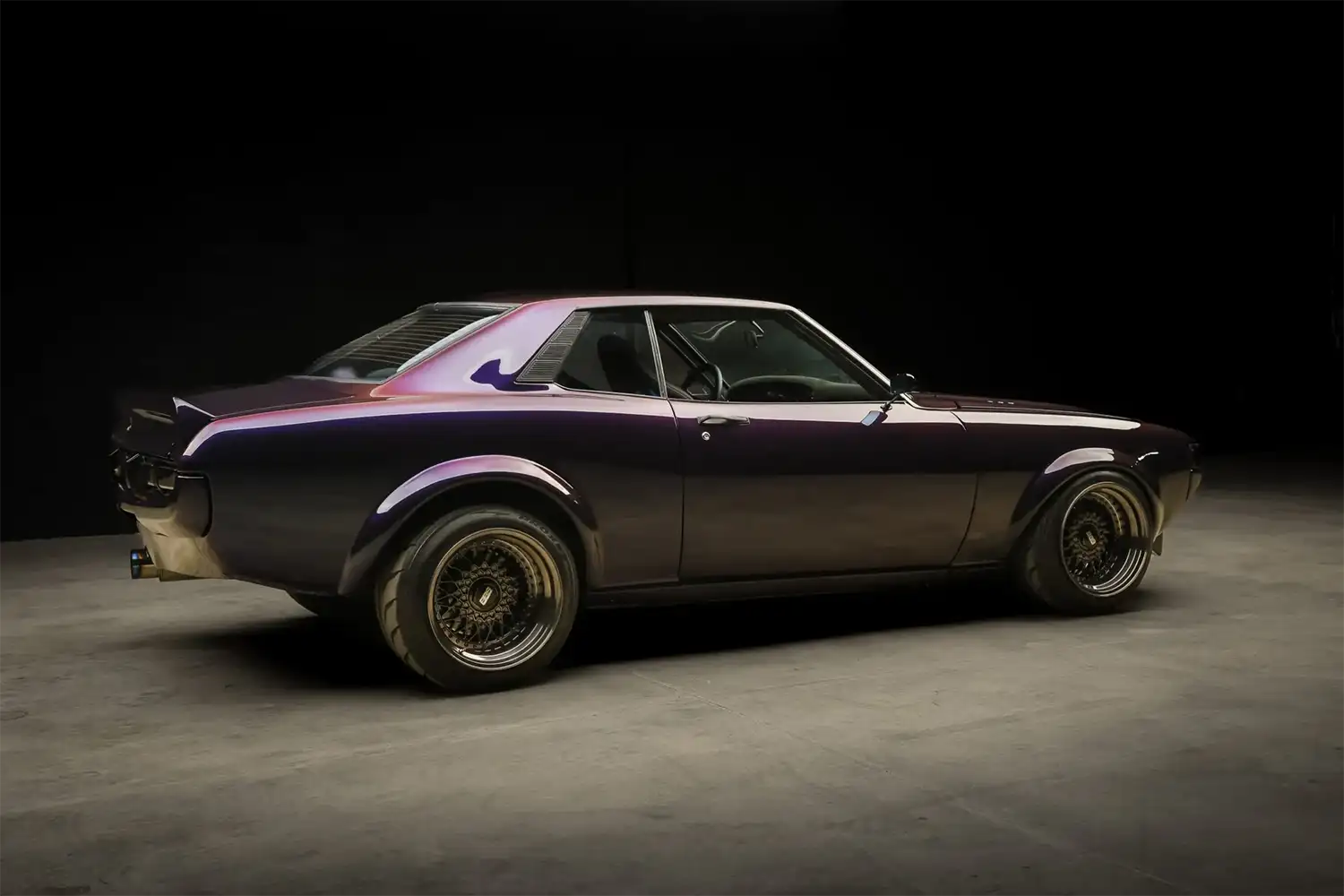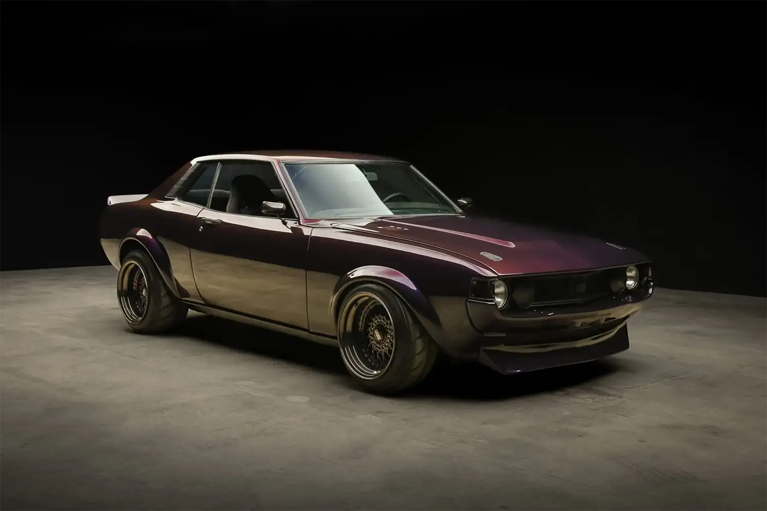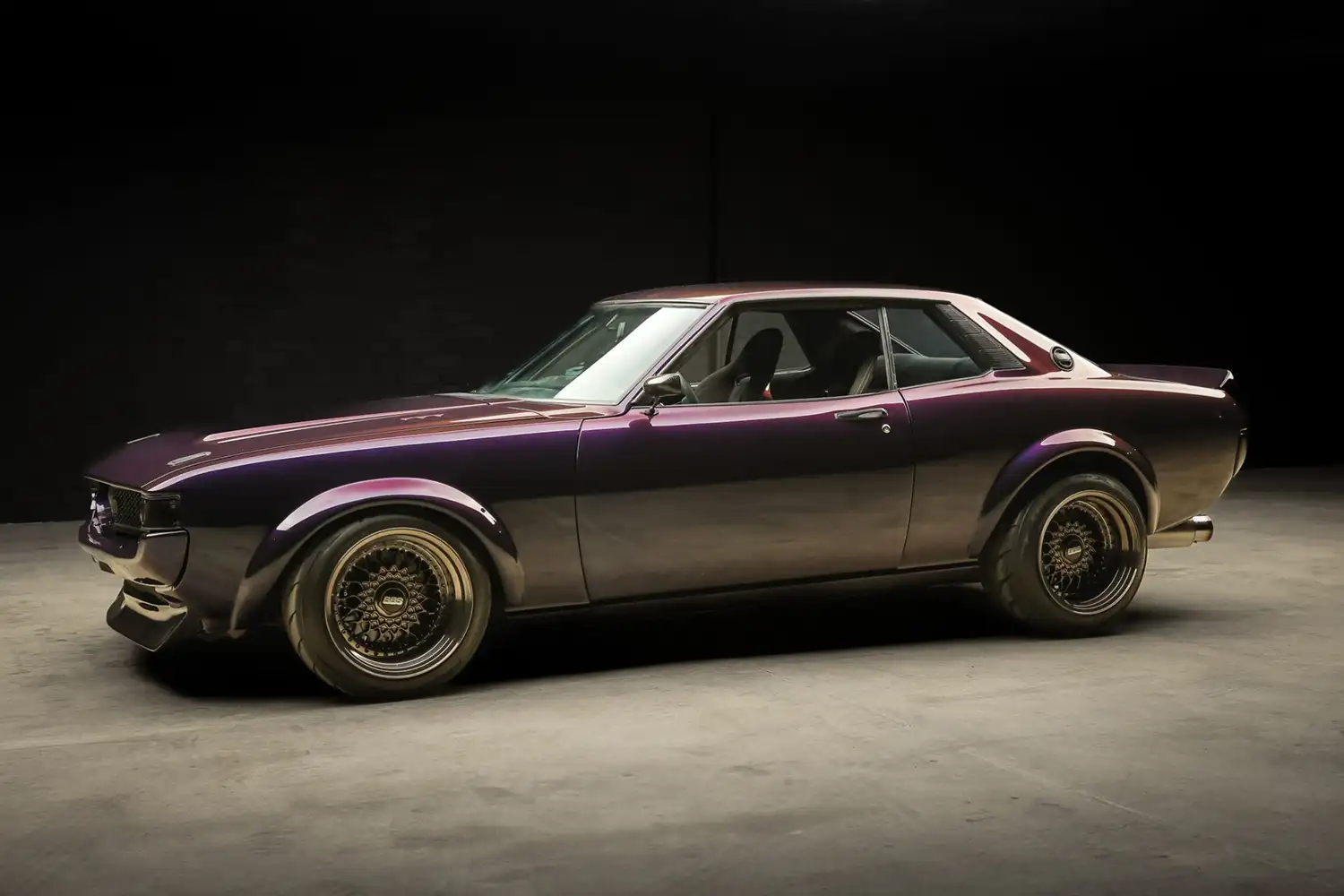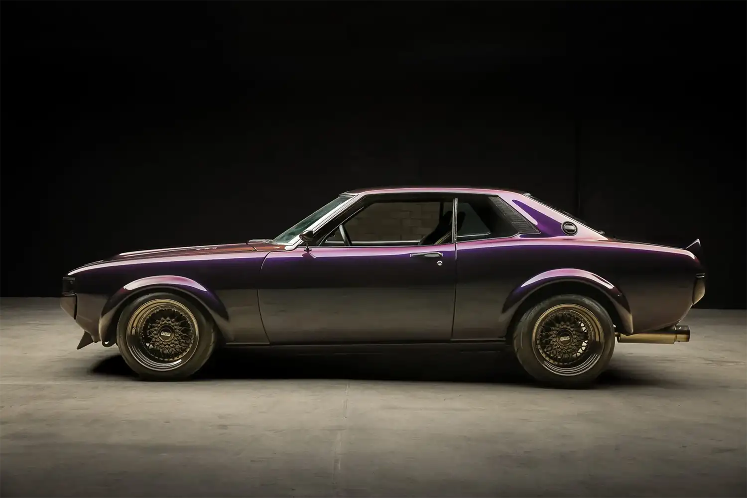 This 1977 Toyota Celica has been fitted with a 2.2-liter Honda F22C inline-four and repainted in Nissan Midnight Purple III. Additional equipment includes a six-speed manual transmission, a limited-slip differential, staggered-width 16″ BBS RS wheels, Wilwood disc brakes, AccuAir air suspension, Addco sway bars, Jenvey individual throttle bodies, and a J’s Racing tubular header, as well as fiberglass bumpers, front and rear spoilers, flared wheel arches, Bride bucket seats, carbon-fiber interior trim, an NRG steering wheel and quick-release hub, and aftermarket stereo components. This modified Celica is now offered at no reserve on dealer consignment with a California title.