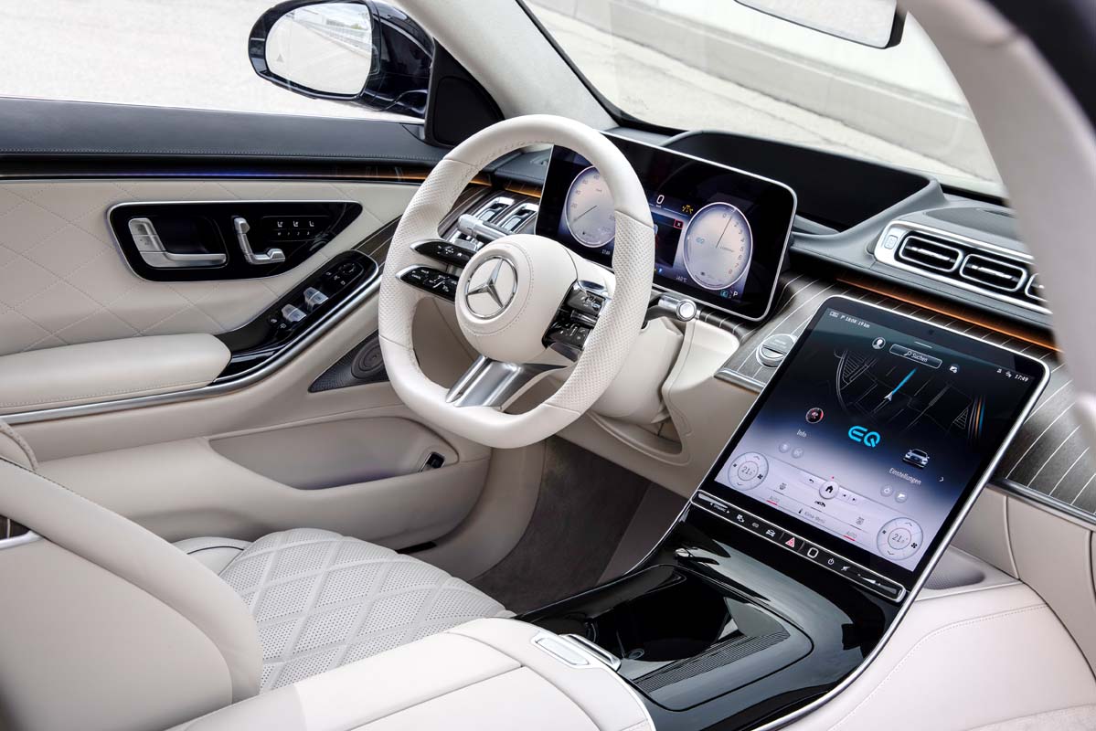 With the S 580 e (combined fuel consumption: 1.5-1.1 l/100 km, combined CO2 emissions: 33.0-26.0 g/km, combined electrical consumption: 22.0-20.2 kWh/100 km)[1] the fourth generation of the hybrid drive system is now celebrating its premiere in the S-Class. The plug-in hybrid is available to order, in both short and long wheelbase versions, with price starting at 123,736 euros[2]. The range of engines has just recently been enhanced by the addition of the mild hybrid S 580 4MATIC (combined fuel consumption: 10.6-10.0 l/100 km, combined CO2 emissions: 242-228 g/km)[3]. This V8 petrol engine with integrated second-generation starter-generator and 48-volt on-board electrical system is also available with both wheelbases, with prices starting at 126,366.10 euros2. For the modification year, Mercedes-Benz has upgraded the equipment of its flagship. The E-ACTIVE BODY CONTROL active suspension is now available. Also new safety and comfort options that are already familiar from the Mercedes-Maybach S-Class. For example the MBUX Interior Assistant and the seat belt feeder for the rear.