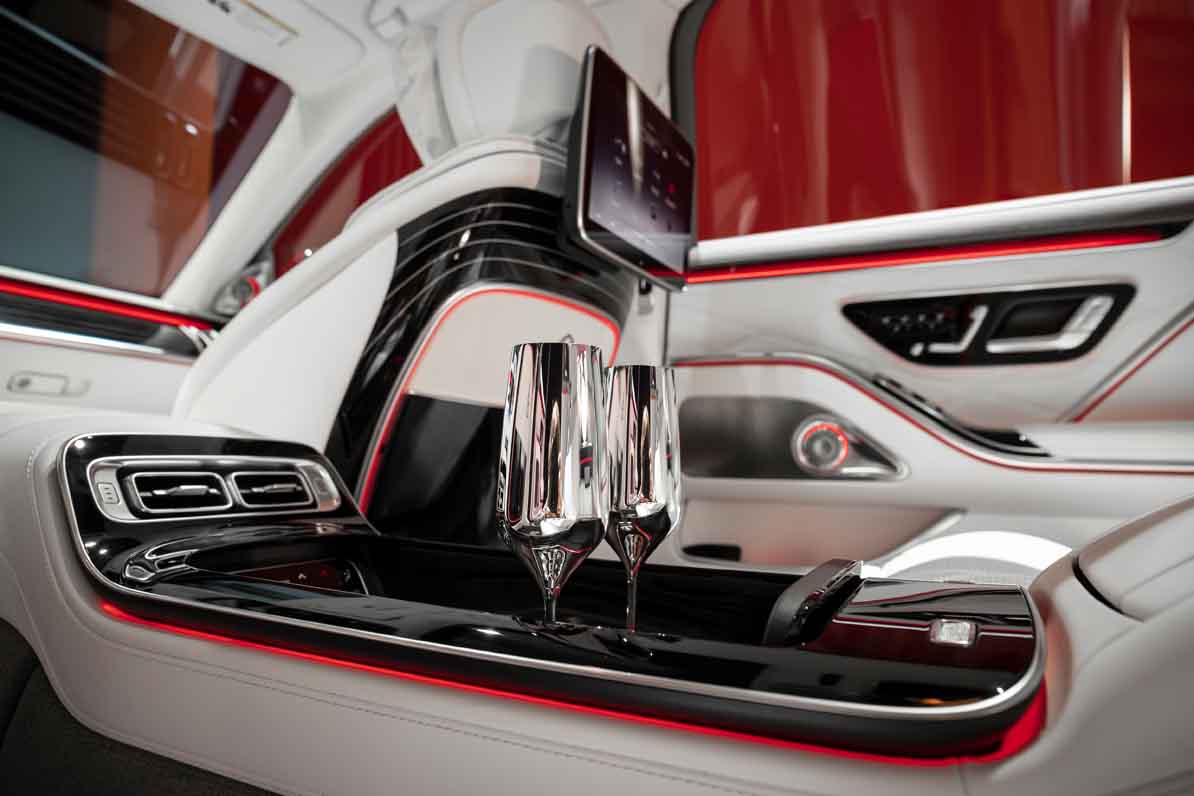 • The silver-plated champagne goblets (3808 euros) round off the exclusive atmosphere in the rear of the Mercedes-Maybach. A tailor-made insert in the stowage compartment and two matching holders in the centre console hold the goblets in place even when on the move.