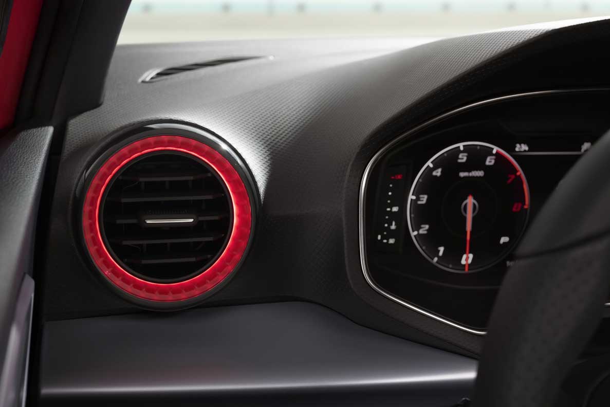 The use of lighting technology adds to the SEAT Ibiza’s interior personality. The driver and passenger side redesigned air vents benefit from surrounding LED lights – for FR and Xcellence-, with a different colour available depending on the trim level chosen – Daring Red for FR trim, Burgundy for Xcellence trim and Honey for Style and Reference trims -. It means the cabin space is more in-sync with the customer.