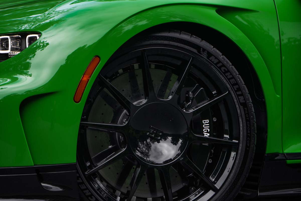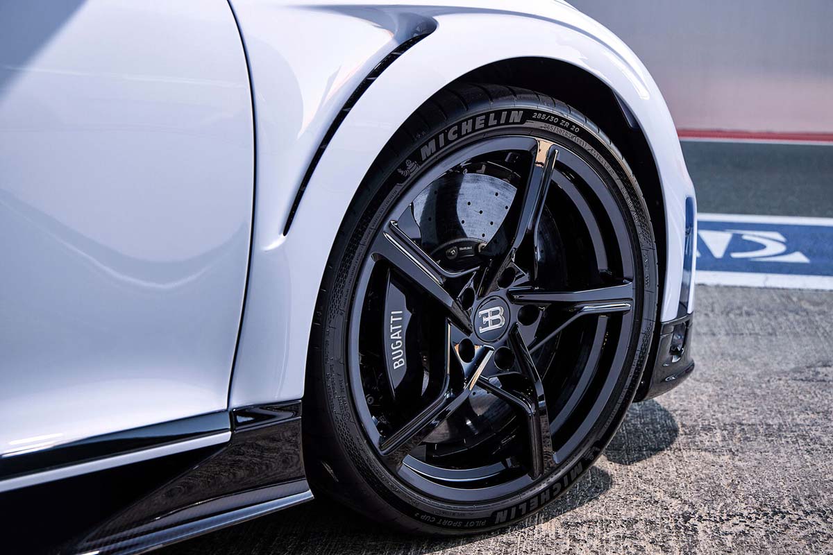 Newly developed Pilot-Sport-Cup-2 tires from Michelin, optimized for the higher top speed, offer more rigidity and running smoothness above 420 km/h than the Chiron. The individual tires were tested at speeds above 500 km/h. This has been made possible by a new technology using reinforced layers, capable of withstanding incredible forces – tested in a facility originally built for fighter jets. The front tires are sized 285/30 R20 ZR and the rear tires 355/25 R21 ZR. After production, every tire is x-rayed to detect even the smallest irregularities. Michelin Pilot-Sport-Cup-2 tires are designed for extreme longitudinal dynamics and therefore support the philosophy of the Bugatti Chiron Super Sport.