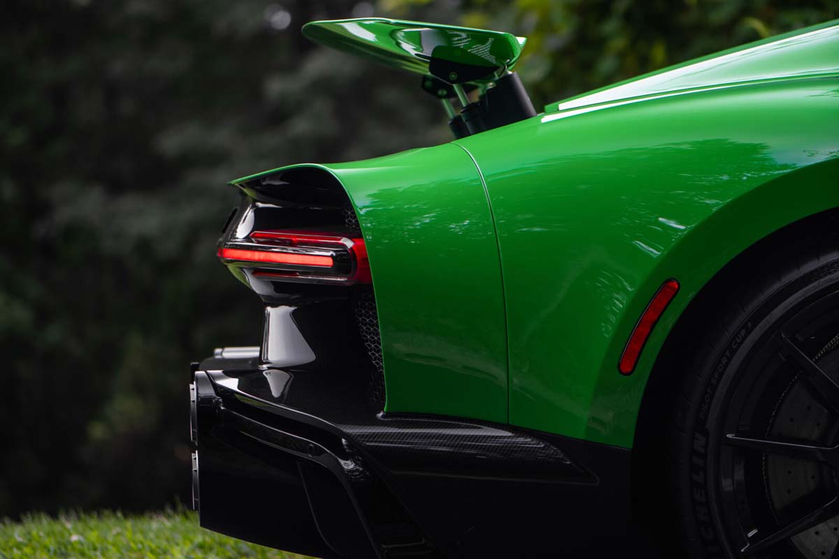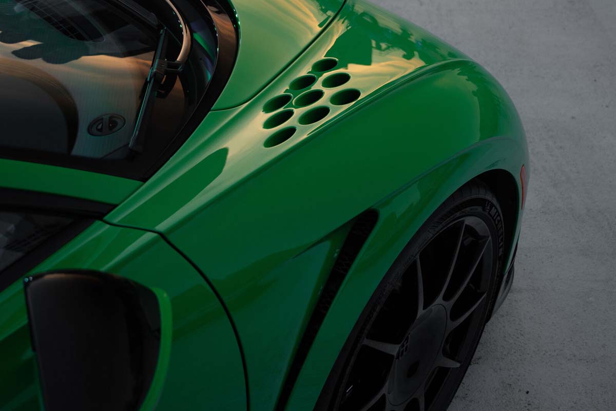 The nine cylindrical air outlets are 30-millimeter-deep wing penetrations, connected to the respective wheel arch by a special carbon air-guiding component, which ensures optimum air flow, while preventing stones from leaving the car. At the same time, the new wings improve brake cooling. Similar to a chimney, a vacuum caused by the airflow along the car’s body extracts air from the wheel arches. In addition, the air is guided through special venting ducts and sucked out of the wheel arches behind the front wheels. Stylistically, these elements are placed like gills behind the front wheels.