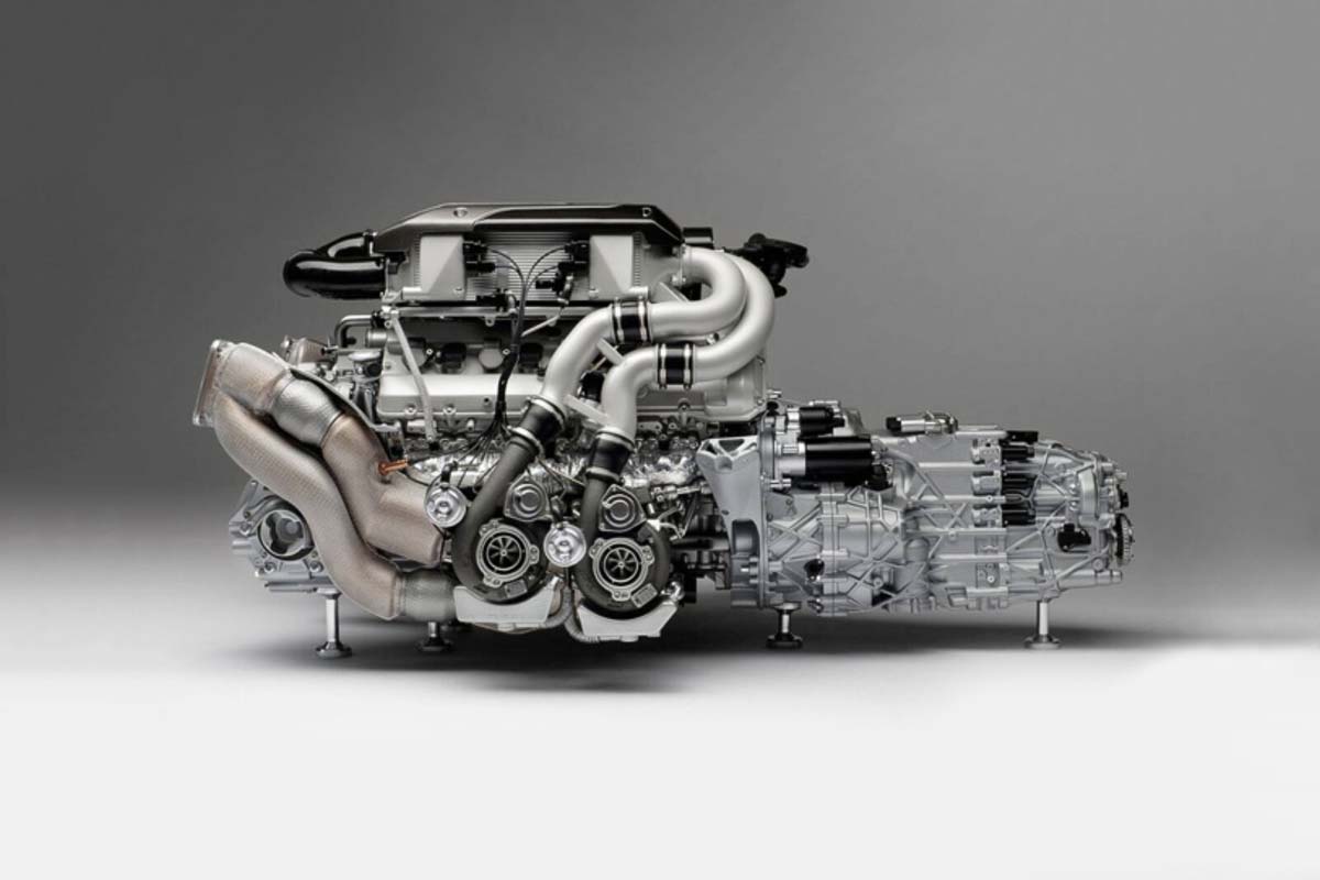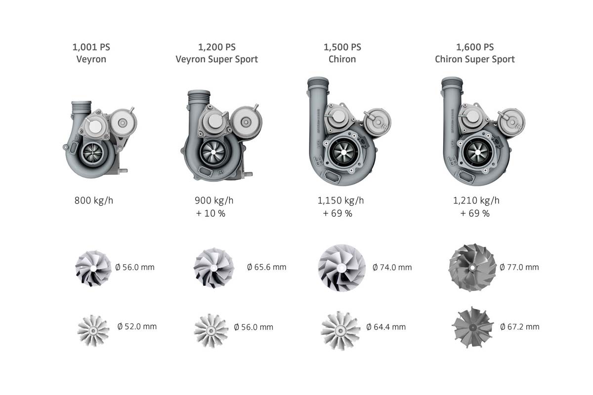 Apart from higher rpms, the increase in performance is also a product of optimized and newly developed turbochargers. All four turbos now use a compressor wheel that grew in size from 74 to 77 millimeters, to allow for a higher throughput. The turbine wheel grew from 64.4 to 67.2 millimeters in diameter, to be able to provide more compressor power, necessary for the increase in boost pressure. At full load, 4.8 tons of air flow through the four turbochargers every hour. Optimizing blade geometry improves thermodynamic efficiency. The throttle response is similar to that of the Chiron.