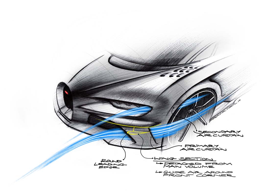 Above 400 km/h, a balanced and safe driving behavior is paramount. “Only perfect incoming airflow at the front of the car will keep harmful turbulence at bay and ensure that the airflow around the car stays clean,” says Frank Heyl, Deputy Design Director at Bugatti.