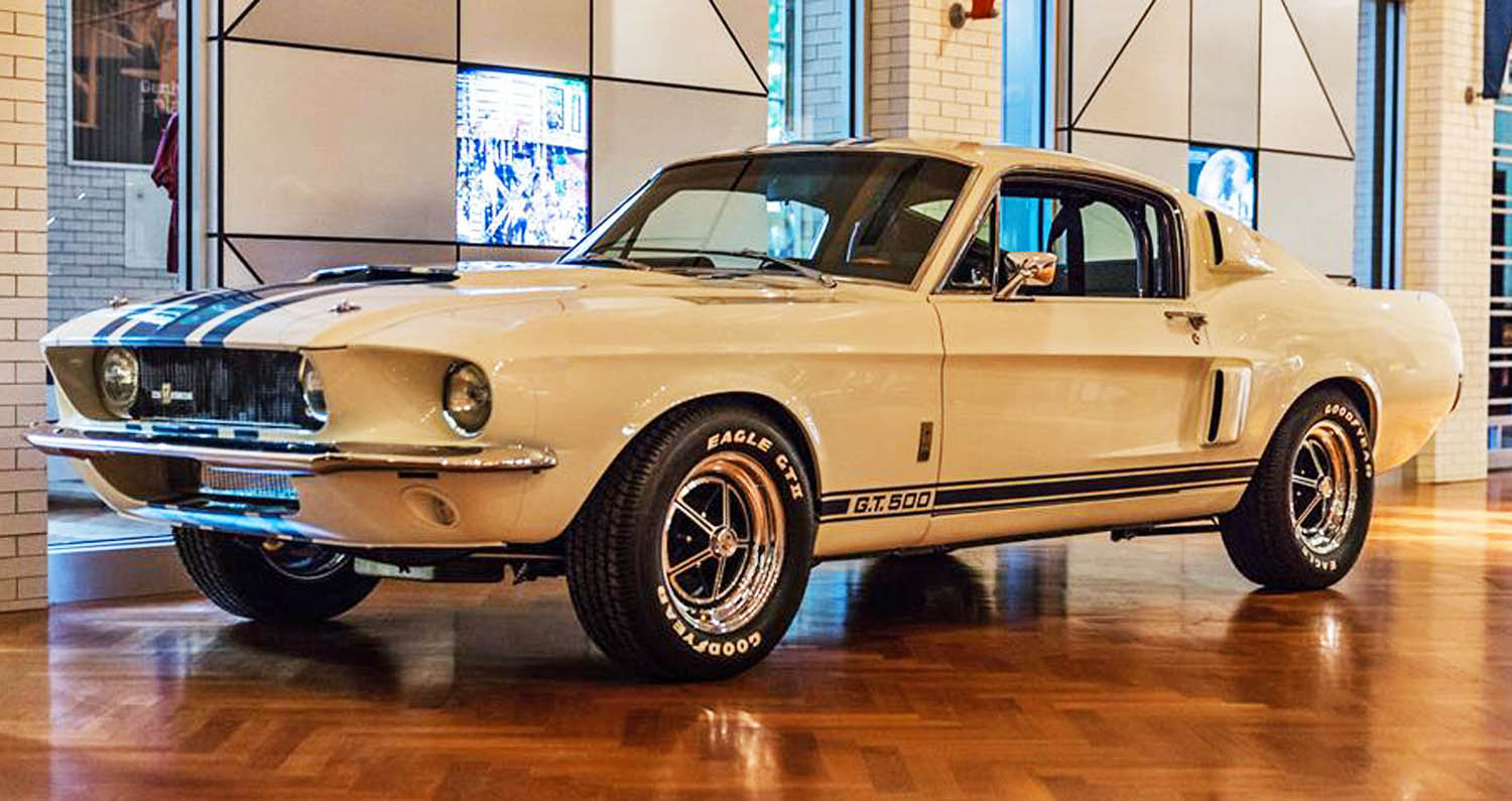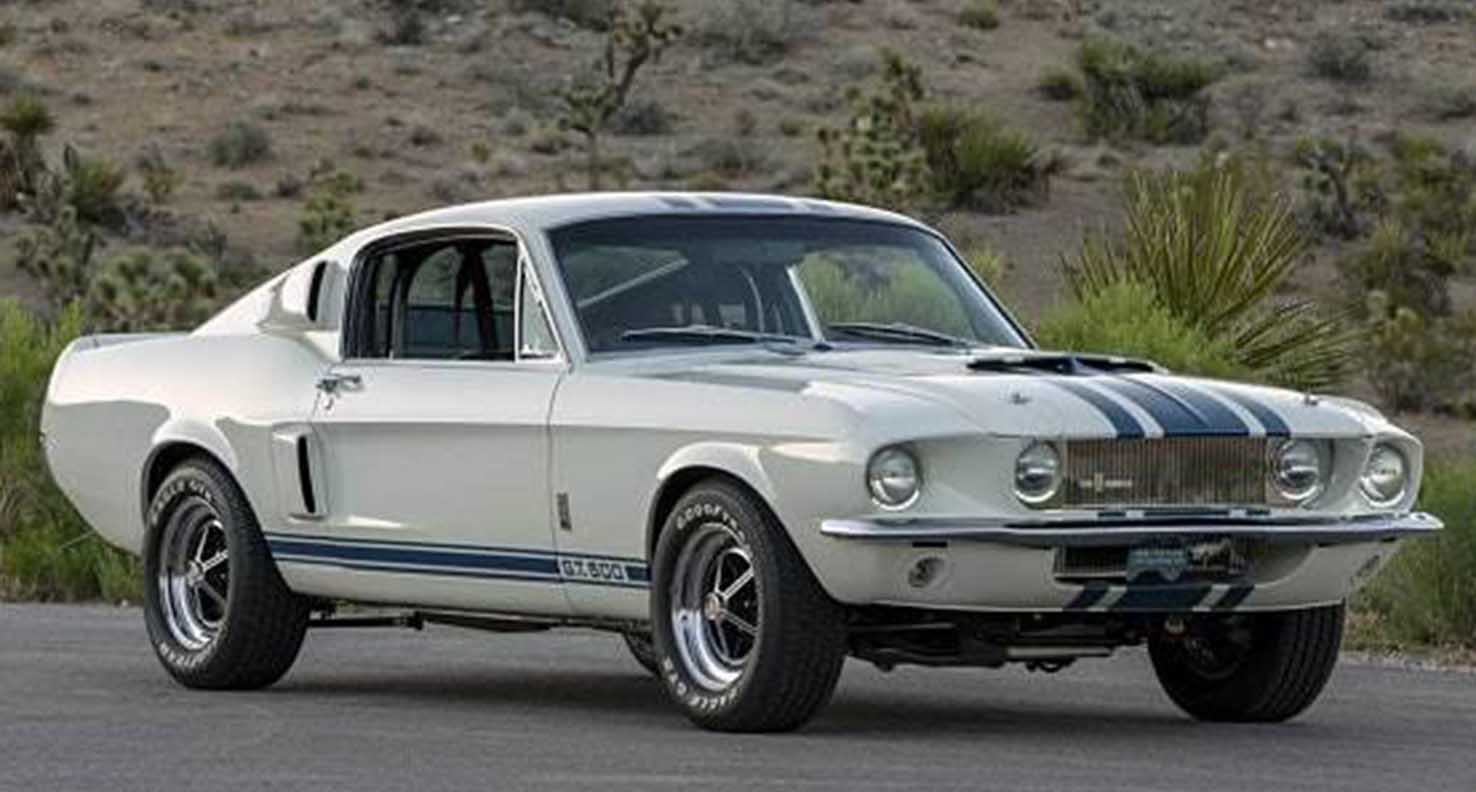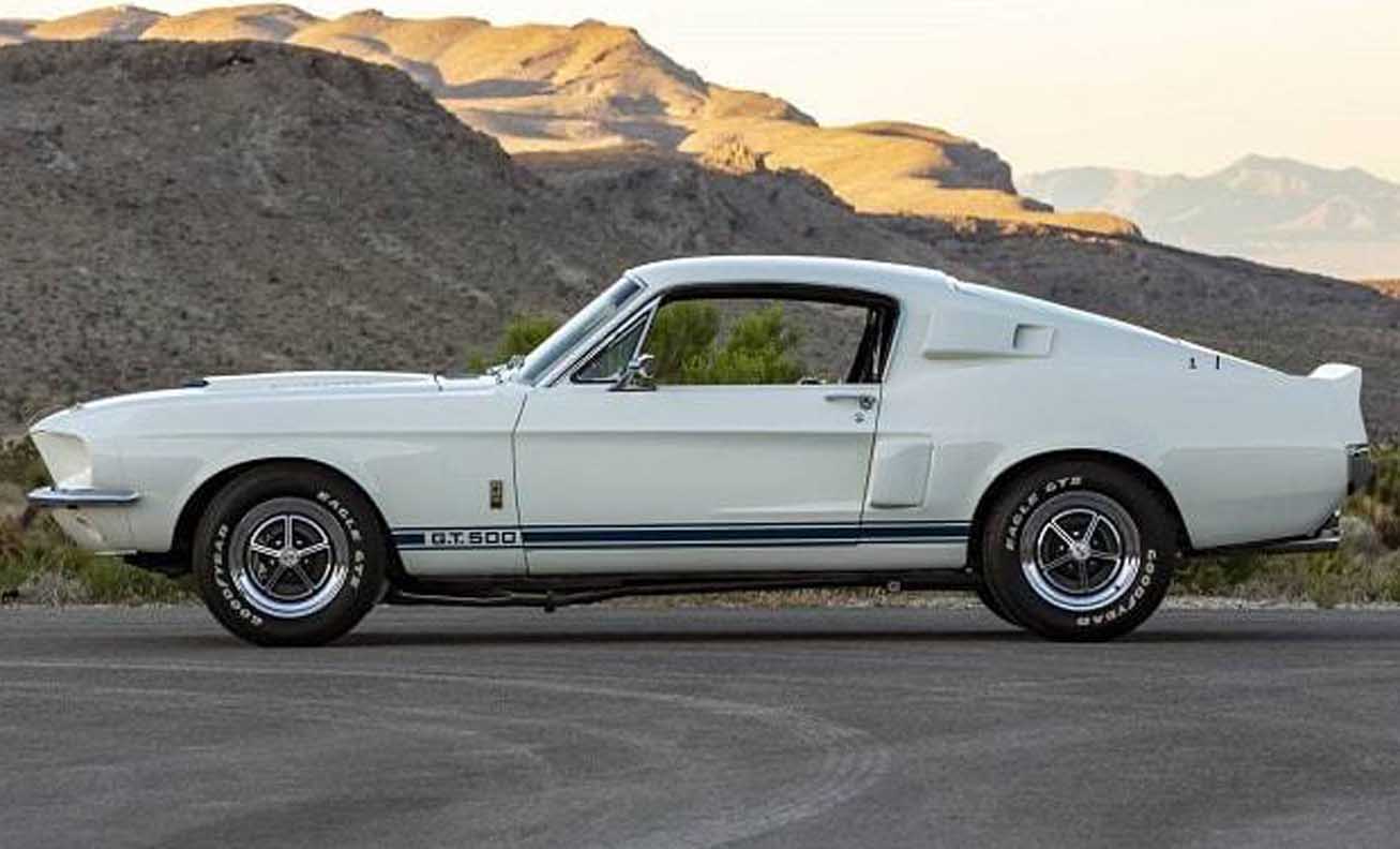 Shelby chief engineer Fred Goodell randomly chose a white fastback for transformation in 1967. He first replaced the engine with a lightweight medium riser 427 motor. The race motor was fitted with a host of modifications that was said to increase output to 520 horsepower. Shelby added heavy duty front disc brakes, Detroit Locker rear end, rear traction bars and special Goodyear Thunderbolt tires. The Super Snake sported unique triple stripes and a redesigned grille for improved air cooling.