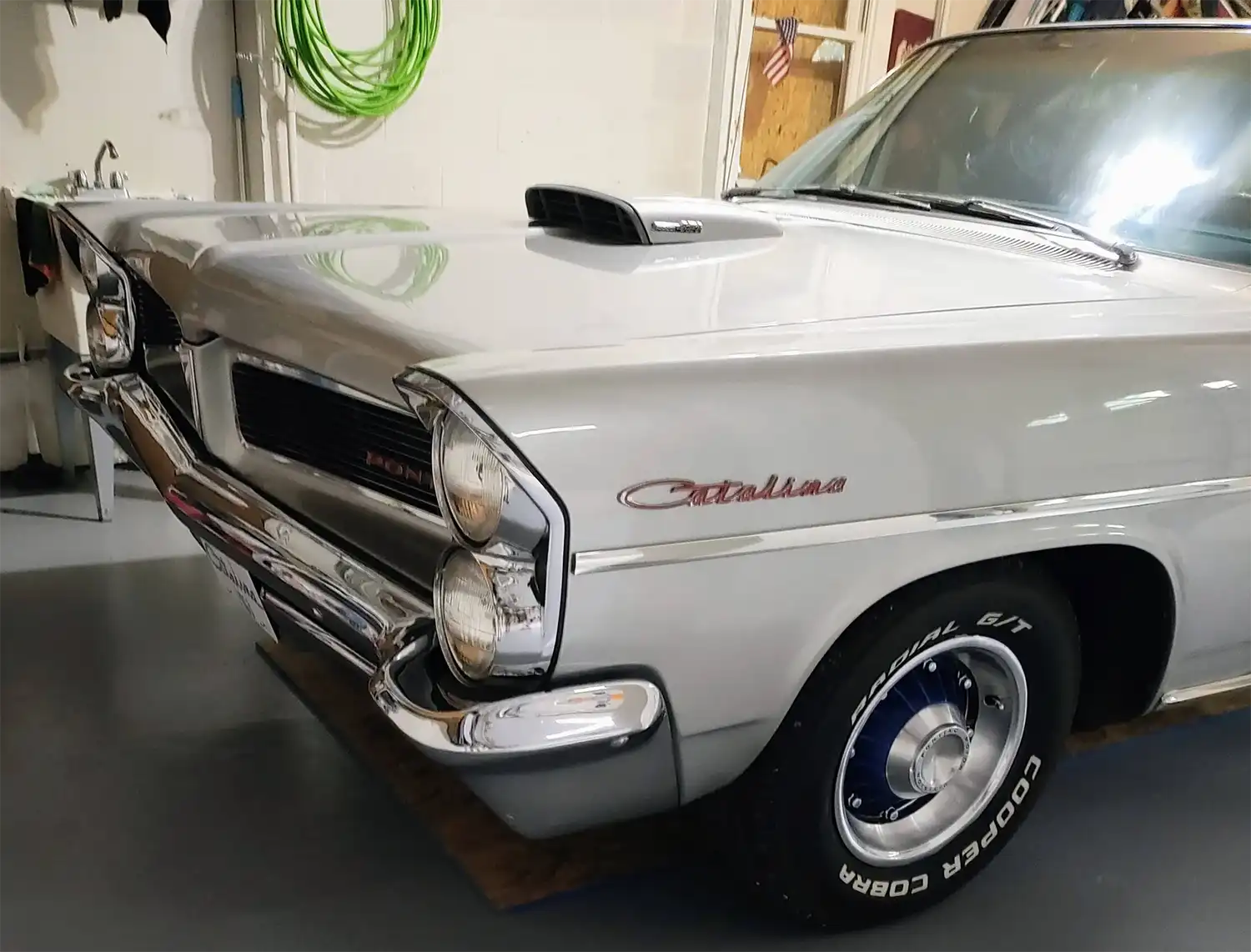 Exterior Elegance: The exterior of this Catalina Coupe is finished in its original-style Silver Blue, showcasing the clean lines and classic design of the era. The body is reported to be straight, with a clean undercarriage. All original glass remains, and the chrome and window moldings are noted to be in excellent condition, reflecting meticulous care. Dual mirrors add to safety and visibility. The car rides on distinctive 8-lug wheels, a hallmark Pontiac styling cue.