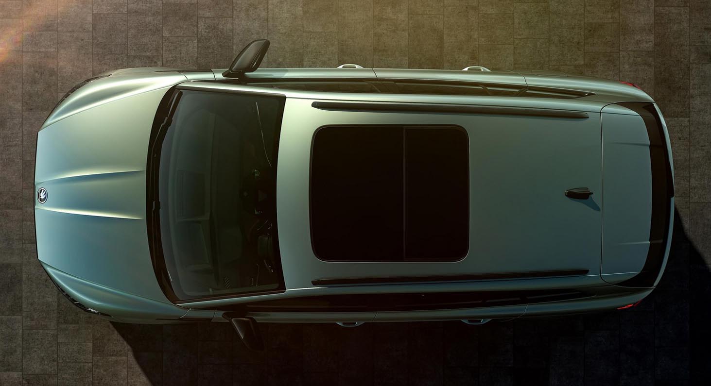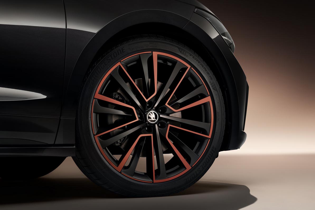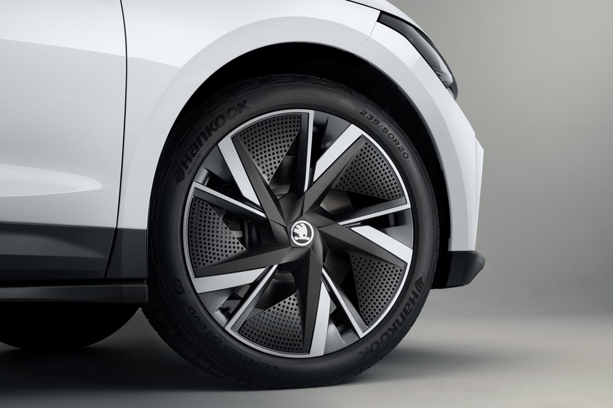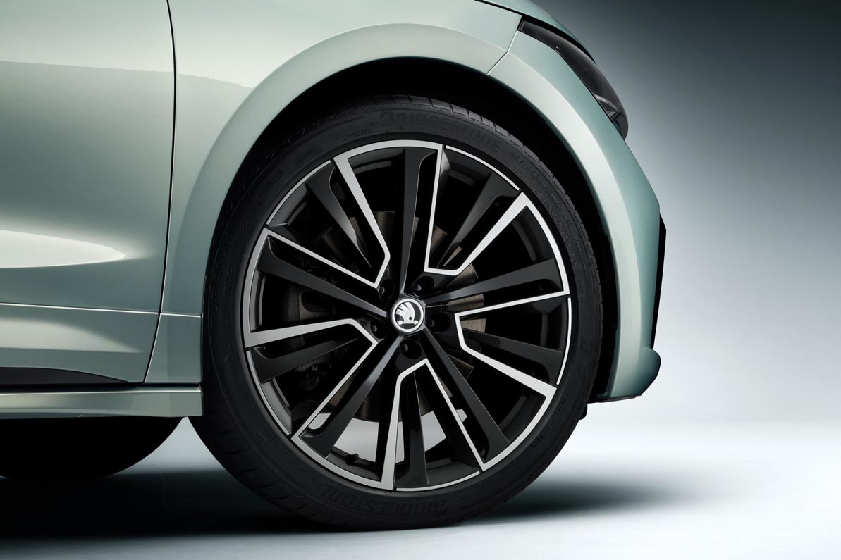 ‘ŠKODA’ is positioned in block lettering on the middle of the tailgate and is framed by a matt black roof spoiler and a rear bumper featuring a grey diffuser. A panoramic sliding roof is available on request; the roof rails, window frames and the frame of the ŠKODA grille provide contrasts in a choice of chrome, matt or gloss black. The range of paint finishes includes two standard and seven metallic colours. The ENYAQ 50 iV comes with 18-inch steel wheels as standard, whilst all other models are fitted with alloys. A total of eight different wheel sets are available, with diameters ranging from 18 to 21 inches.