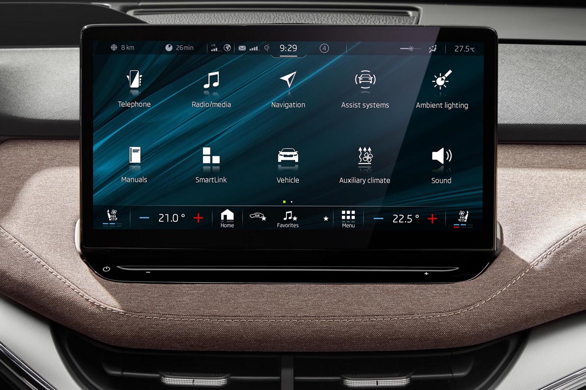 The permanent online connection provided by the built-in eSIM allows many functions to be backed by online support. Traffic Information, for example, makes use of online data, as does the navigation system’s route planning. The comprehensive ŠKODA Connect mobile online services offer functions specific to an electric vehicle too. This means that, via the ŠKODA Connect app or web portal, the owner can also remotely control battery charging, switch on the air conditioning before starting their journey or set corresponding schedules. Furthermore, the Internet connection enables ‘over the air’ updates for maps and system software.
