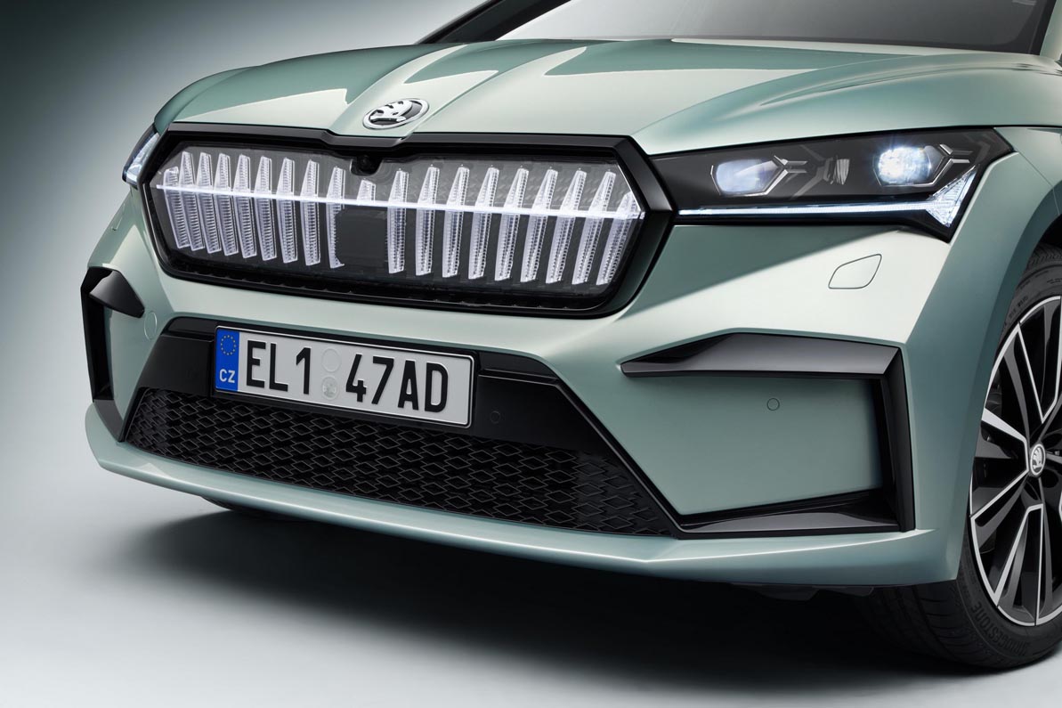 Featuring its own interpretation of the emotive ŠKODA design language, distinctive ŠKODA grille, and wheels that provide a rugged appearance with diameters ranging from 18 to 21 inches, the ENYAQ iV is as much a true ŠKODA as it is a true SUV. Its bold, contoured front, complete with a sculptured bonnet and full LED Matrix headlights, makes it unmistakable as a member of ŠKODA’s SUV family. However, the Czech manufacturer’s first all-electric SUV has a unique character of its own too, as it is equipped with an upright ŠKODA grille that has been brought further forward. This is further emphasised by the SUV’s innovative Crystal Face: from the ENYAQ 80 iV upwards, 130 LEDs light up the vertical slats, and a horizontal strip illuminates the ŠKODA grille.