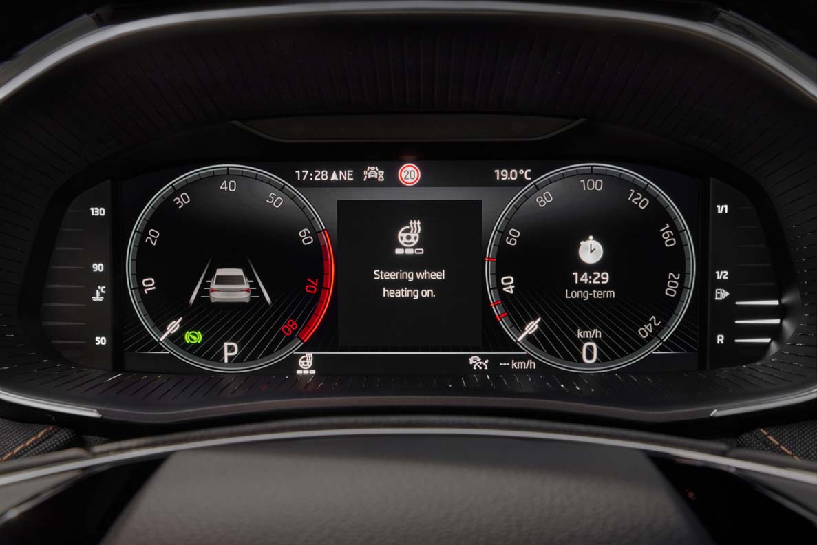 This is the first-ever ŠKODA FABIA that is optionally available with a digital instrument cluster, which boasts a 10.25-inch digital display. Drivers can choose from different layouts to suit their needs. These include the Classic layout, which is based on the style of analogue round instruments, as well as the Modern, Reduced and Extended layouts. As part of the optional Dynamics pack, there’s a fifth option – the Sport layout, in which the rev counter takes centre stage. The ‘Virtual Cockpit’, as the digital instrument cluster is also referred to, can display radio station emblems, covers of music albums and stored pictures of callers, among other things. Furthermore, the map can zoom in on junctions and display them in a separate window. As standard, the FABIA comes with an analogue instrument panel and a 3.5-inch information screen.
