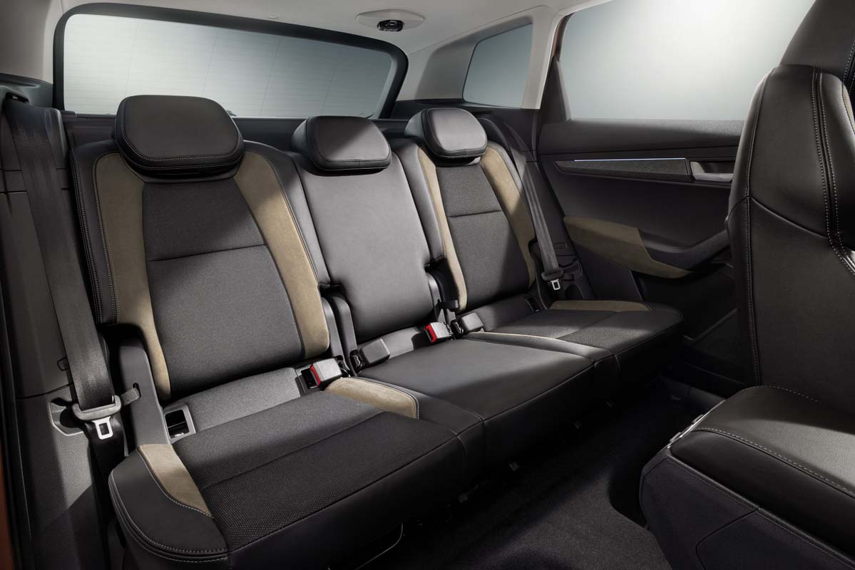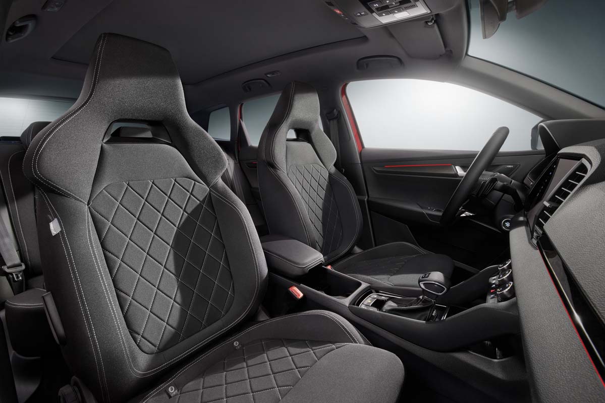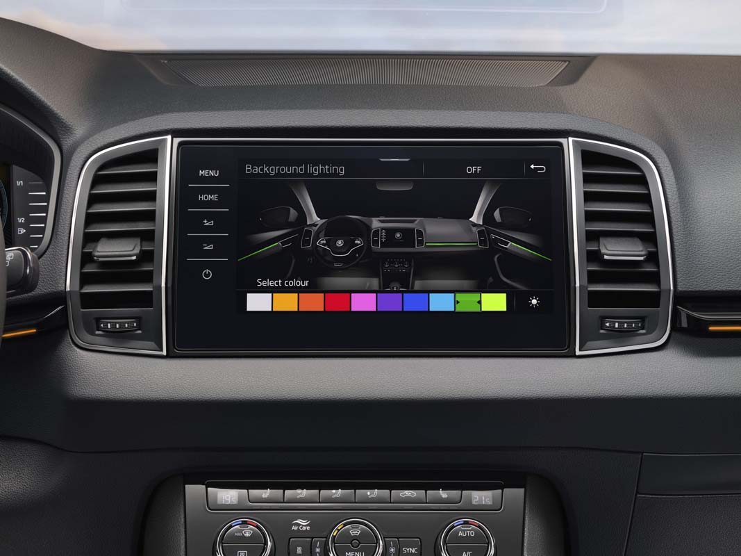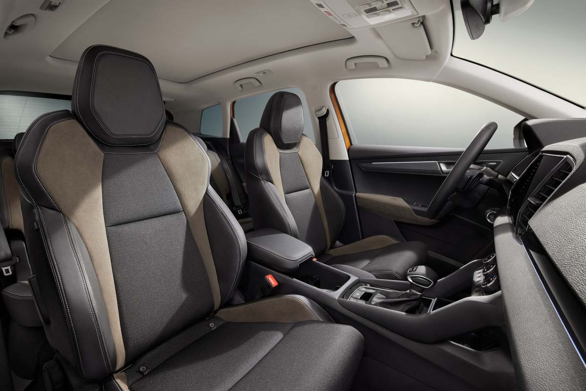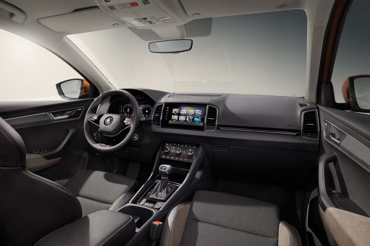 The interior is characterised by black sports styling, with Piano Black decorative strips on the instrument panel and a carbon-fibre-effect decor on the doors. The roof lining is also black, as are the breathable ThermoFlux covers of the sports seats with integrated headrests. The leather gearstick features silver contrasting stitching. The three-spoke multifunction sports steering wheel is adorned with a SPORTLINE badge and the front door sill trims bear KAROQ lettering. The LED ambient lighting is a standard feature in the sporty range-topping model and now also illuminates the rear door panels in one of the ten colour options.