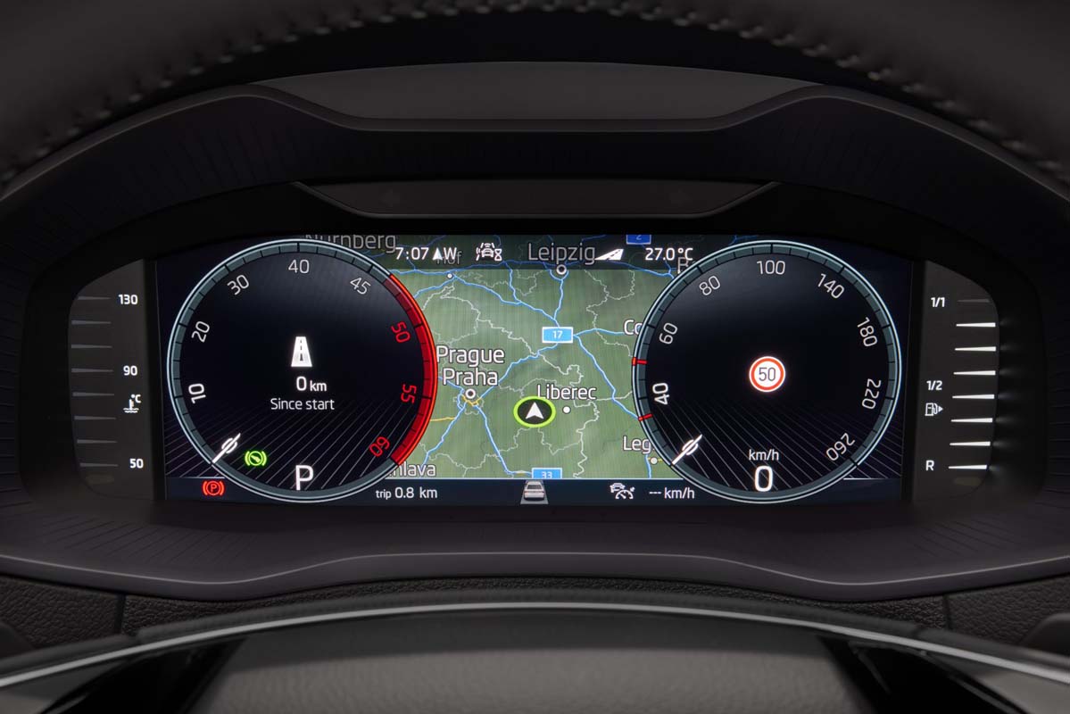 Over the course of 2022, the ŠKODA KAROQ will be equipped with a digital instrument cluster as standard. The 8-inch display will replace the previous analogue instruments. From the Ambition trim level upwards, the digital instrument cluster (or ‘Virtual Cockpit’ as it is also referred to) is available with a 10.25-inch display as an option. This offers five basic layouts and can be configured individually.