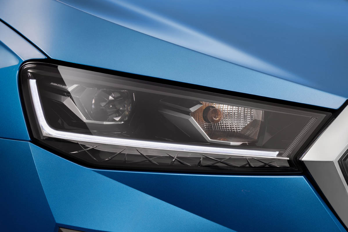 The entry-level headlights come with halogen lamps for low beam and high beam, while the daytime running lights make use of LED technology. In the top-end specification, a hexagonal LED module produces the low beam and high beam, while the daytime running lights are provided by a striking, sharply defined L-shaped LED strip. There is also a choice of two variants for the rear lights which are split in two. Even the entry-level specification features LED tail lights and brake lights, forming the ŠKODA-typical C-shaped light cluster. The SLAVIA Ambition and Style also boast an LED tail light module on the tailgate.