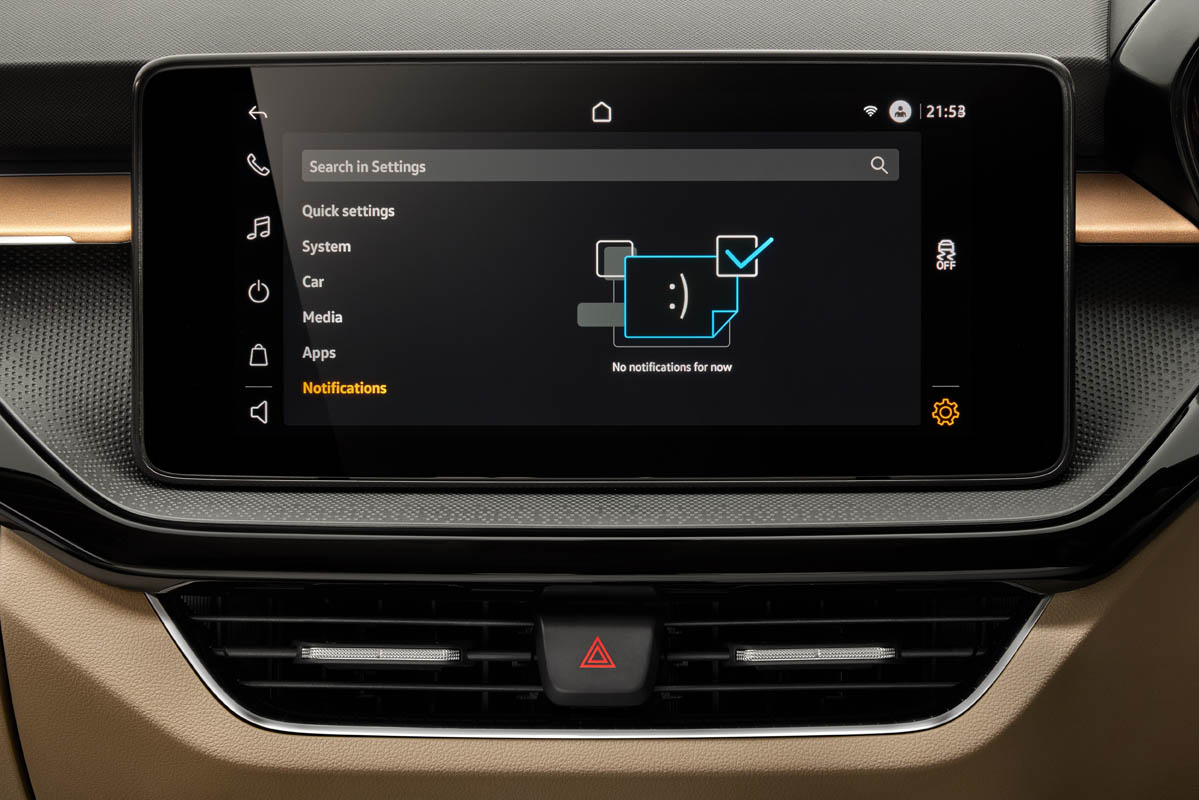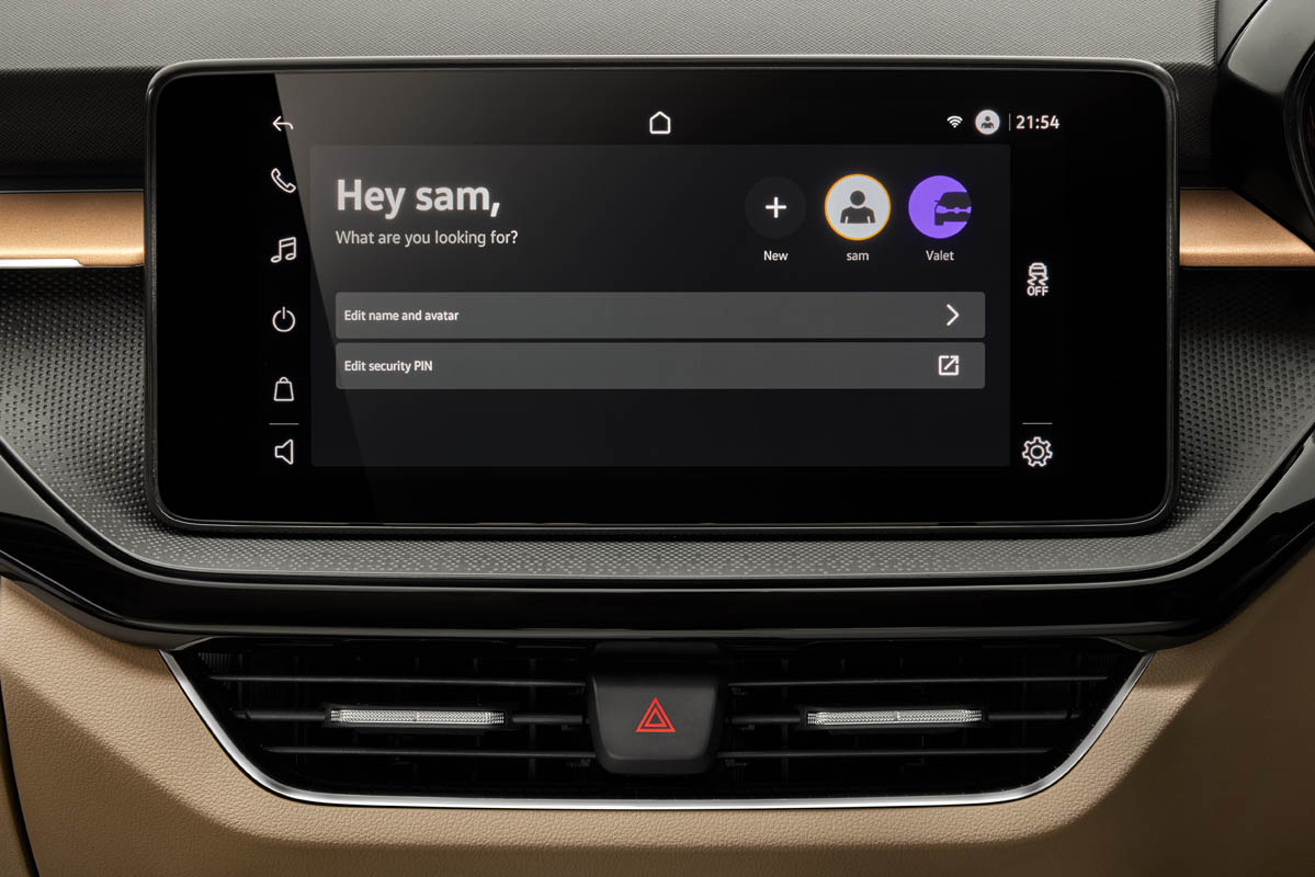 The new SLAVIA’s interior is based on the latest design concept of ŠKODA’s European models. A free-standing infotainment screen measuring up to 10 inches takes centre stage. The circular air vents are another striking feature. From Ambition upwards, touch-control Climatronic with Air Care function comes as standard, while comfort features such as ventilated front seats upholstered in leather are available for the top-end specification Style.