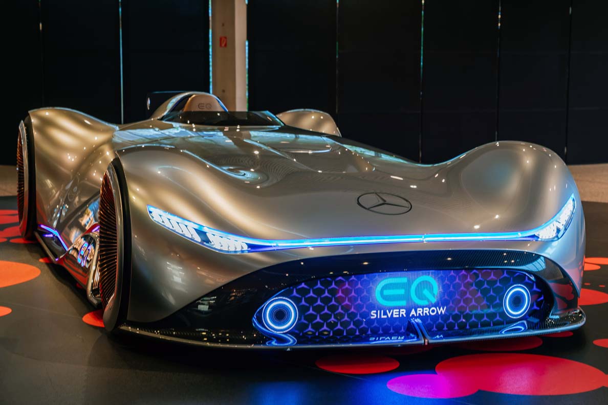 The Vision EQ Silver Arrow, featuring alubeam silver paintwork, is a tribute to the Mercedes-Benz W 125 record-breaking car from 1937. The digital cockpit with a curved panoramic display features a touchscreen that has been integrated into the steering wheel.