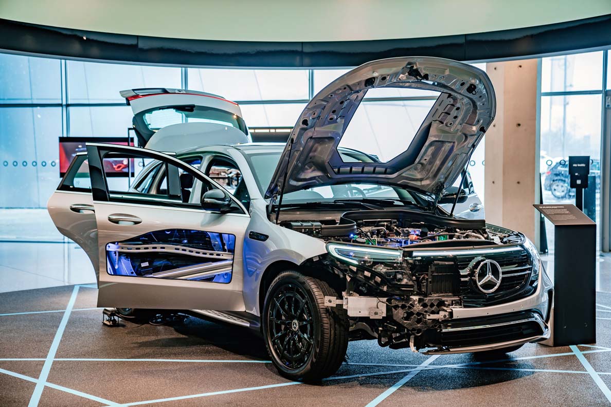A cross-section model of the fully electric EQC 400 4MATIC transparently illustrates its technology. This “see-through” car reveals otherwise concealed components, such as the battery as well as the charging and discharging procedures. An augmented reality scanner grants further insights into the EQC’s vehicle technology.