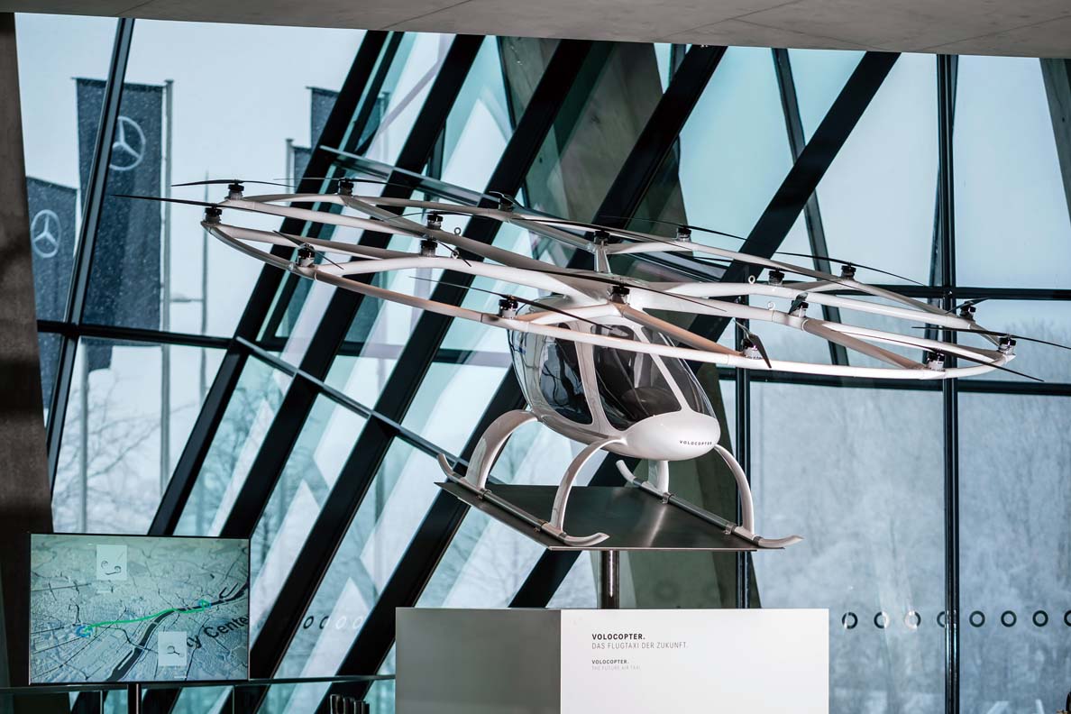 The fully electric VoloCity air taxi with its 18 rotors is Volocopter’s first series-production model. The company plans to offer commercial passenger services which do not generate any local emissions within the next few years. In September 2019, a Volocopter took off from the Mercedes-Benz Museum, marking the first flight in a European city.