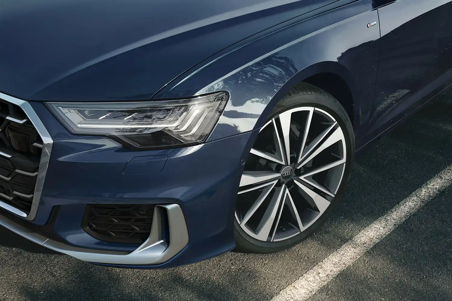 Reflecting strong customer demand for dark rims, the Audi A6 and Audi A7 wheel range has been fundamentally revised; more than half of the variants now have dark rims. The Audi A6 Sedan and Avant come standard with 17-inch forged aluminum wheels in a 10-spoke design and 225/60 tires. The 18-inch wheels in a multi-spoke design are now coated in Graphite Gray for a sportier appearance. There are also 19-inch wheels in a 5-arm dynamic design. The high-gloss 20-inch wheels in a 10-spoke star design in Platinum Gray are now available in Black Metallic, while 21-inch wheels in Graphite Gray with a high-gloss finish and a stylish 5 double-spoke-V design make for dark accents. Completely new to the A6 model range are the 5-arm 21-inch wheels – inspired by motorsport, the airy geometry of the design aids brake cooling.