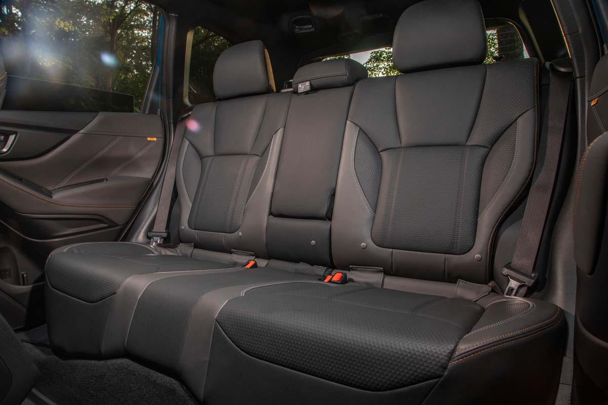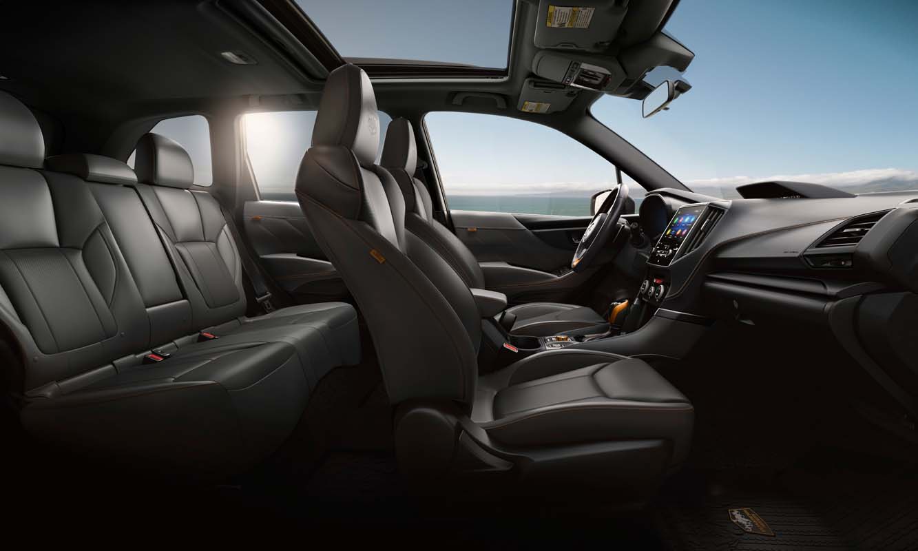 The Forester Touring cabin offers a choice of exclusive Black or Saddle Brown perforated leather trimmed upholstery; 10-way power driver’s seat with 2-position memory (includes power lumbar support); 8-way power front passenger seat, and heated outboard rear seats. LEDs are used for cargo-area and dome lights with off-delay, as well as the rear gate.