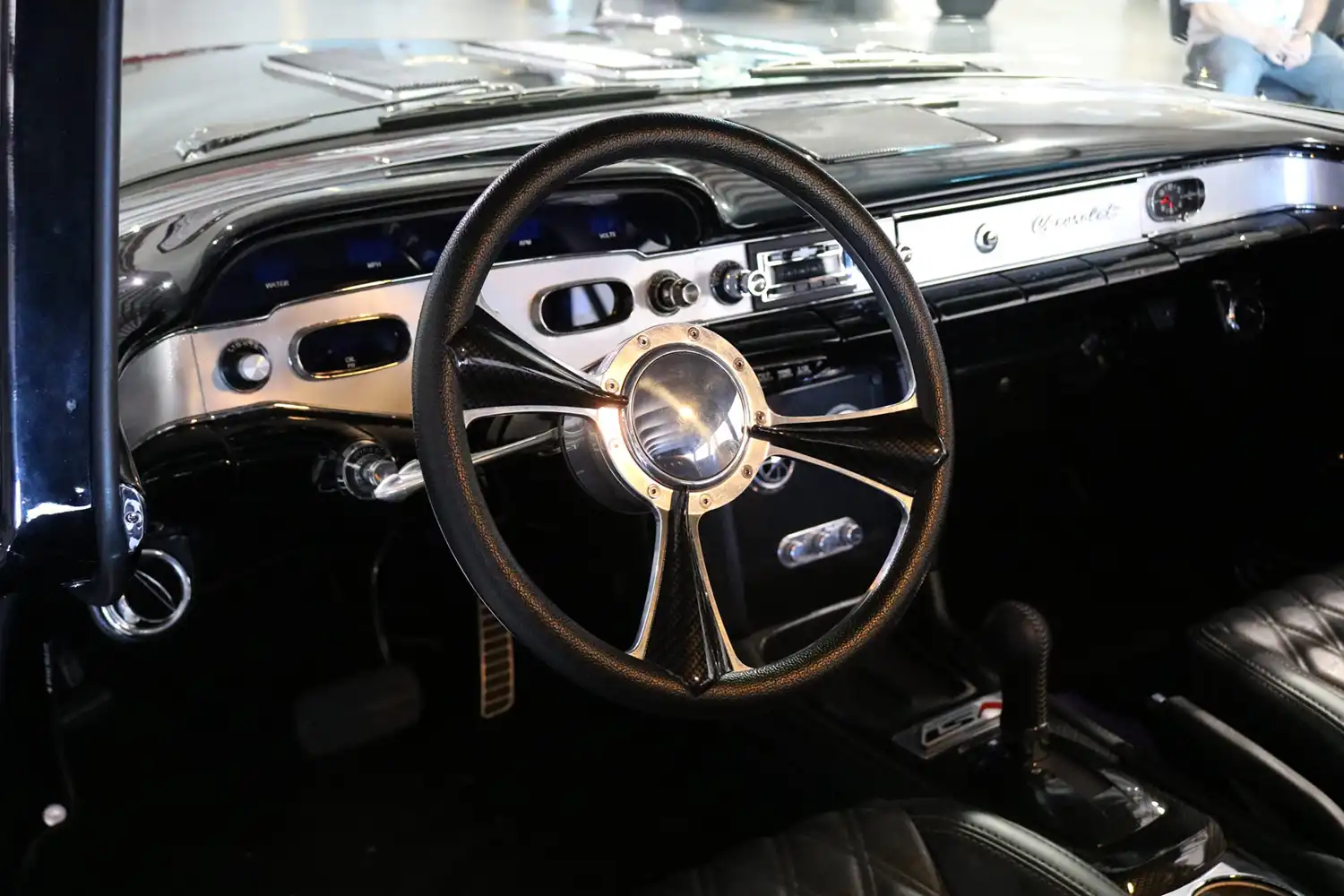 This remarkable 1958 Chevrolet Yeoman two-door station wagon has undergone a comprehensive refurbishment and modification, transforming it into a potent and stylish restomod. Under prior ownership, the body was meticulously repainted in a sleek black finish, setting the stage for the performance upgrades that lie beneath. A supercharged 6.2-liter LSA V8 engine now resides under the hood, paired with a smooth-shifting four-speed automatic transmission and a robust Ford 9″ rear end, promising an exhilarating driving experience.