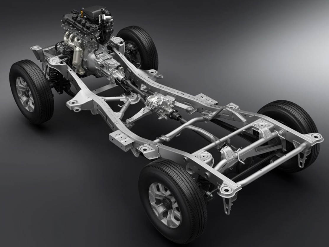 The ladder frame structure provides a solid base for suspension components when driving off-road and also helps protect the vehicle body even on bumpy surfaces. For the all-new Suzuki Jimny, a new “x-member” and two additional cross members have been added for further reinforcement and increased torsional rigidity.