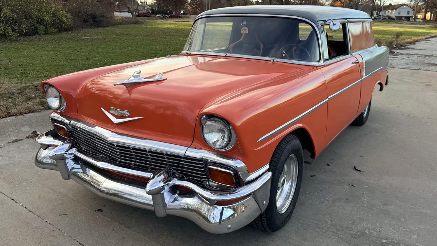 A Hot Rod–styled 1956 Chevrolet 210 Wagon heads to Kansas City with V-8 power, automatic transmission, bold two-tone paint and several updated features. Tubbed rear arches, bucket seats and under-dash A/C give this classic wagon a sharper street-focused character.